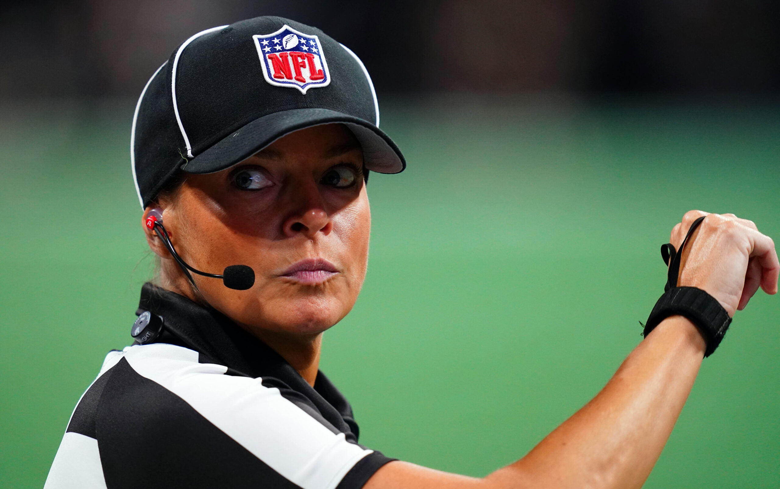 Dec 24, 2023; Atlanta, Georgia, USA; NFL line judge Robin DeLorenzo (134) looks down the sideline during the Atlanta Falcons game against the Indianapolis Colts during the first half at Mercedes-Benz Stadium. Mandatory Credit: John David Mercer-Imagn Images