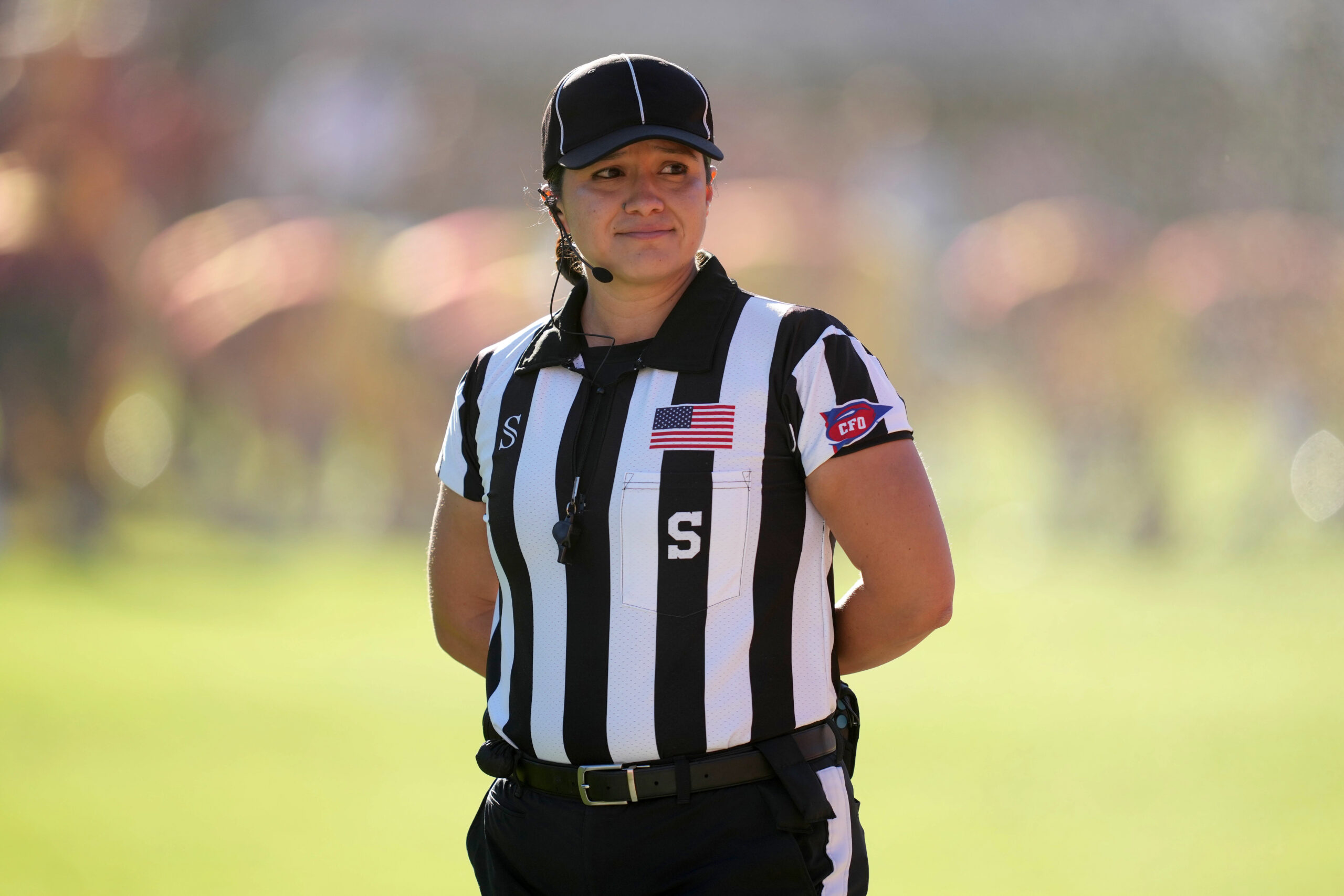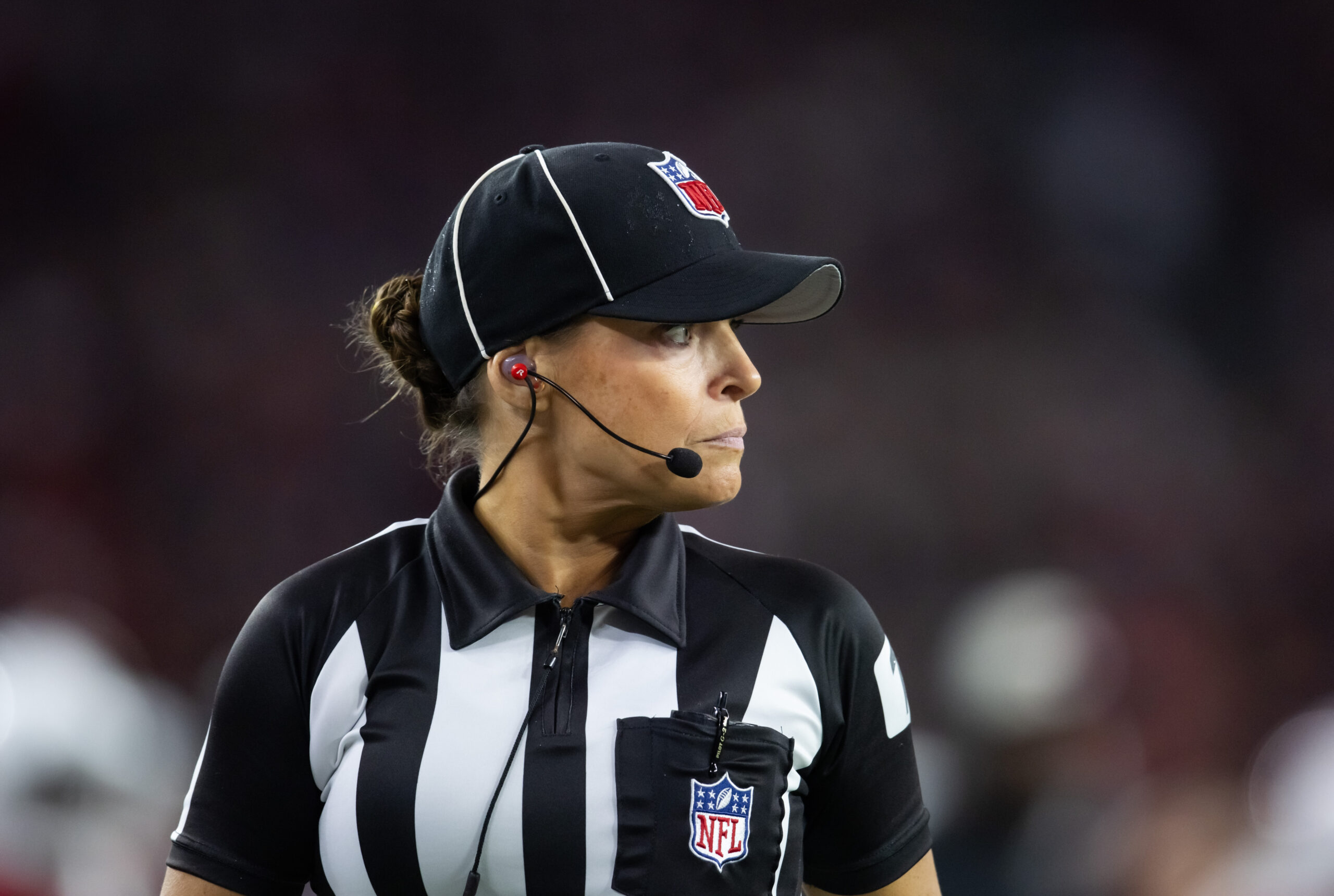 Nov 3, 2024; Glendale, Arizona, USA; NFL line judge Robin DeLorenzo during the Arizona Cardinals game against the Chicago Bears at State Farm Stadium. Mandatory Credit: Mark J. Rebilas-Imagn Images