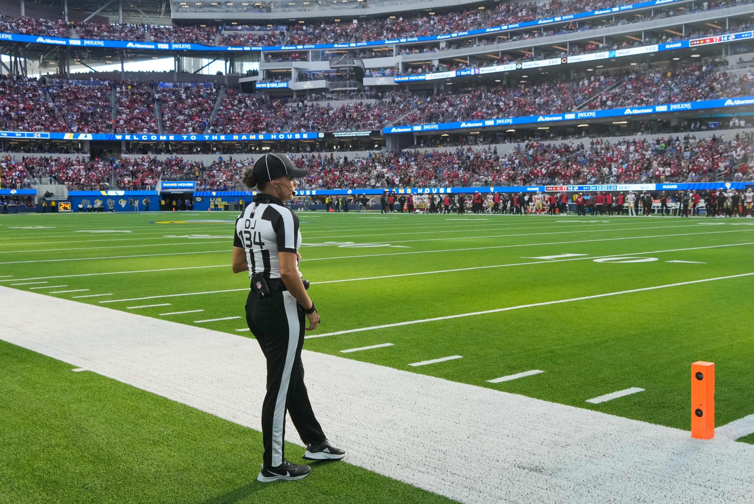 Dec 17, 2023; Inglewood, California, USA; NFL female line judge Robin Delorenzo (134) during the game between the Los Angeles Rams and the Washington Commanders at SoFi Stadium. Mandatory Credit: Kirby Lee-Imagn Images