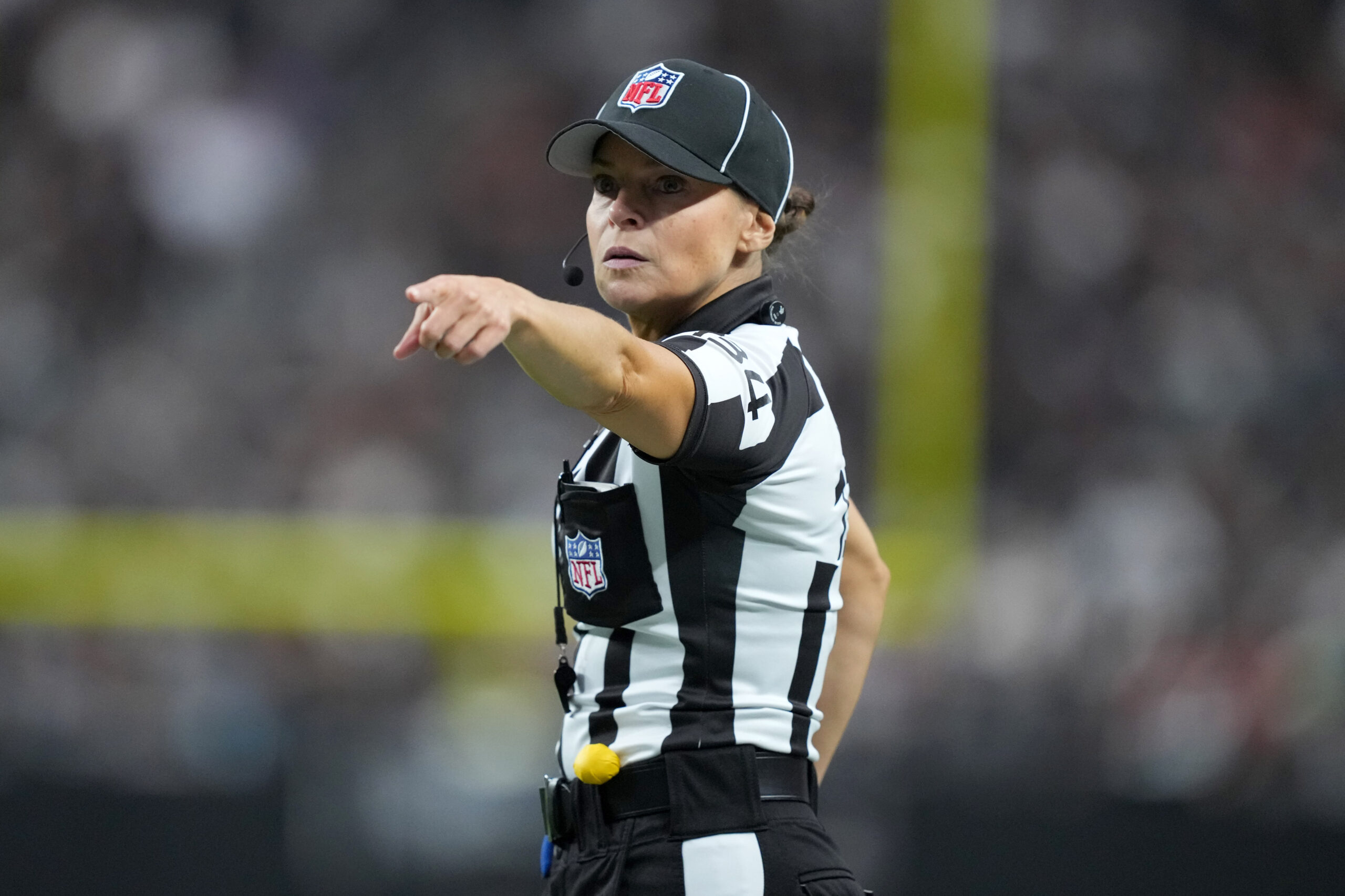 Dec 22, 2024; Paradise, Nevada, USA; NFL line judge Robin DeLorenzo (134) gestures during the game between the Jacksonville Jaguars and the Las Vegas Raiders Allegiant Stadium. Mandatory Credit: Kirby Lee-Imagn Images