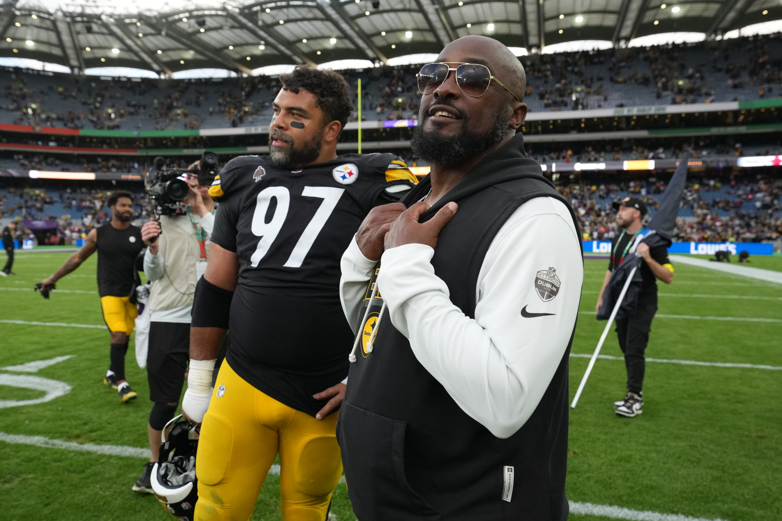 Sep 28, 2025; Dublin, Ireland; Pittsburgh Steelers defensive tackle Cameron Heyward (97) and coach Mike Tomlin react after an NFL International Series game against the Minnesota Vikings at Croke Park. Mandatory Credit: Kirby Lee-Imagn Images