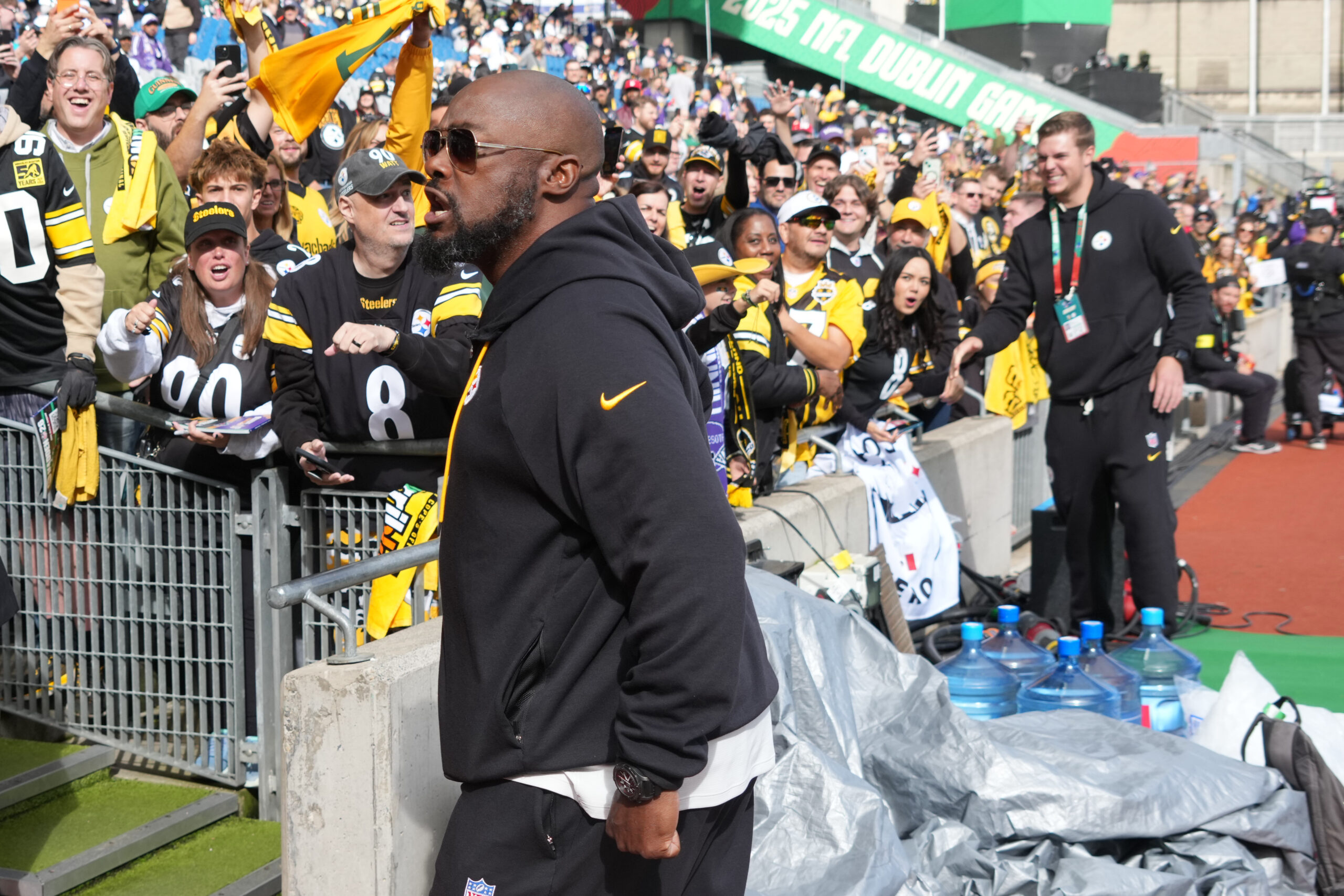Sep 28, 2025; Dublin, Ireland; Pittsburgh Steelers coach Mike Tomlin interacts with fans during an NFL International Series game against the Minnesota Vikings at Croke Park. Mandatory Credit: Kirby Lee-Imagn Images