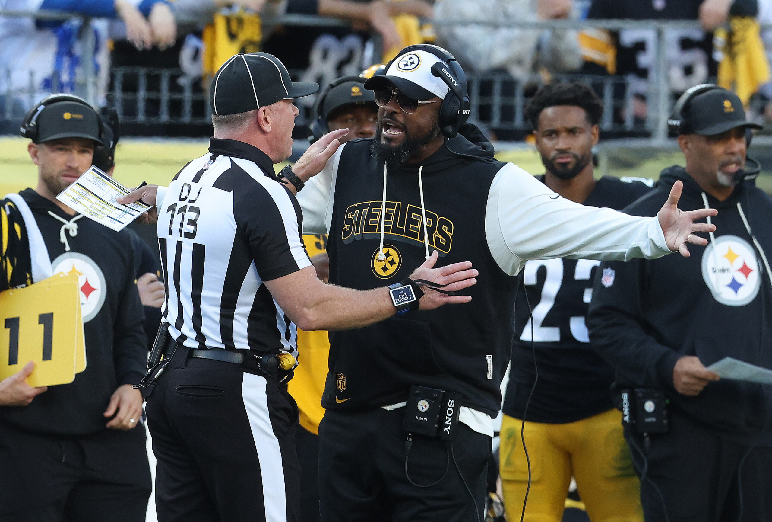 Nov 2, 2025; Pittsburgh, Pennsylvania, USA; Pittsburgh Steelers head coach Mike Tomlin (right) reacts to down judge Danny Short (113) against the Indianapolis Colts during the fourth quarter at Acrisure Stadium. Mandatory Credit: Charles LeClaire-Imagn Images