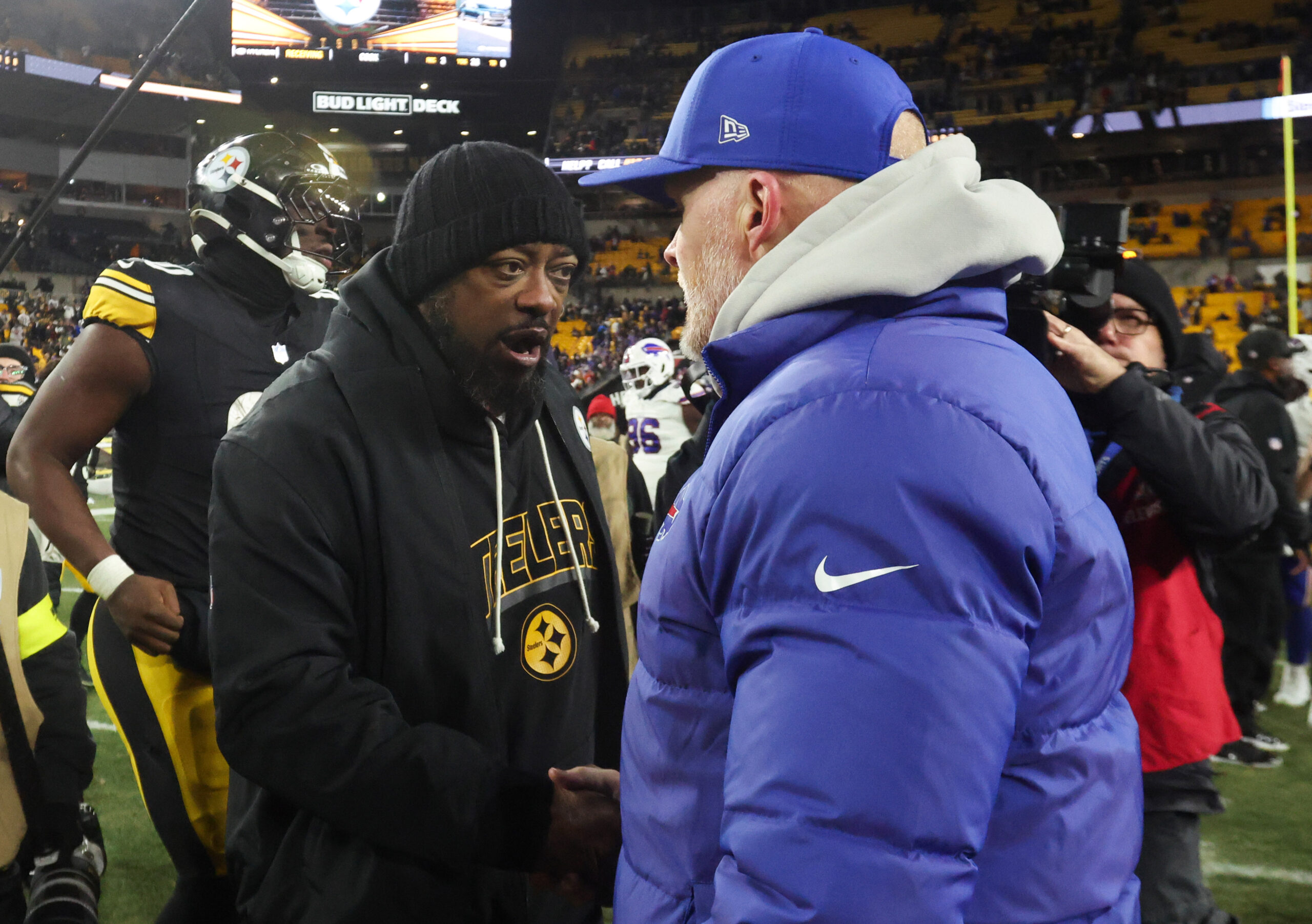 Nov 30, 2025; Pittsburgh, Pennsylvania, USA; Pittsburgh Steelers head coach Mike Tomlin and Buffalo Bills head coach Sean McDermott shake hands after the game at Acrisure Stadium. Mandatory Credit: Charles LeClaire-Imagn Images