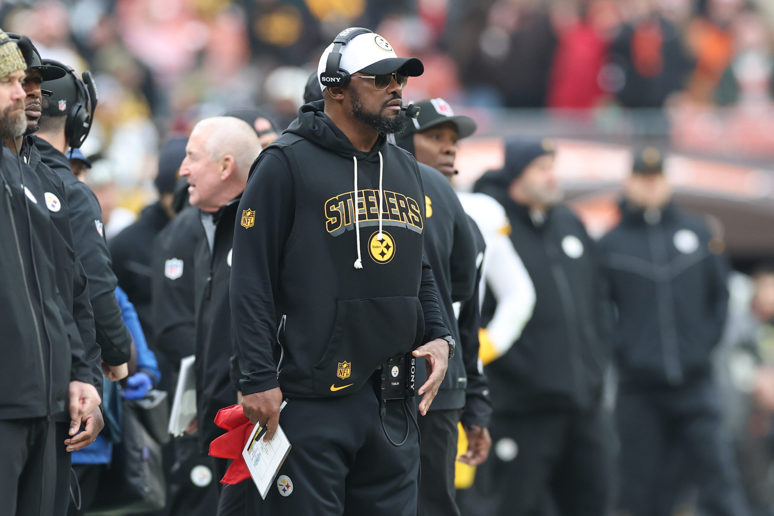 Dec 28, 2025; Cleveland, Ohio, USA; Pittsburgh Steelers head coach Mike Tomlin looks on in the the third quarter against the Cleveland Browns at Huntington Bank Field. Mandatory Credit: Scott Galvin-Imagn Images