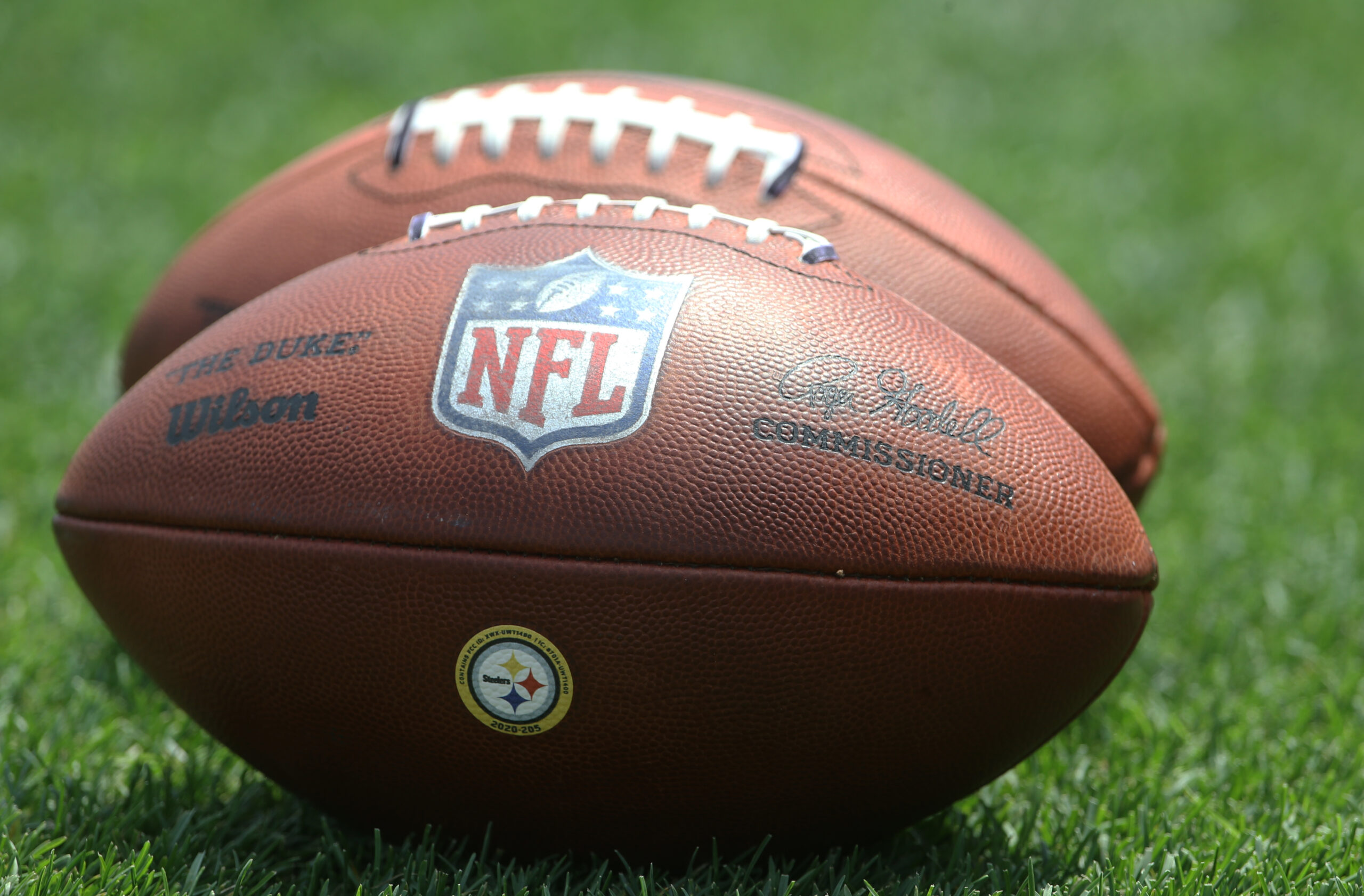 Jul 23, 2021; Pittsburgh, PA, United States; NFL official branded Pittsburgh Steelers footballs are seen during training camp at the Rooney UPMC Sports Performance Complex. Mandatory Credit: Charles LeClaire-Imagn Images