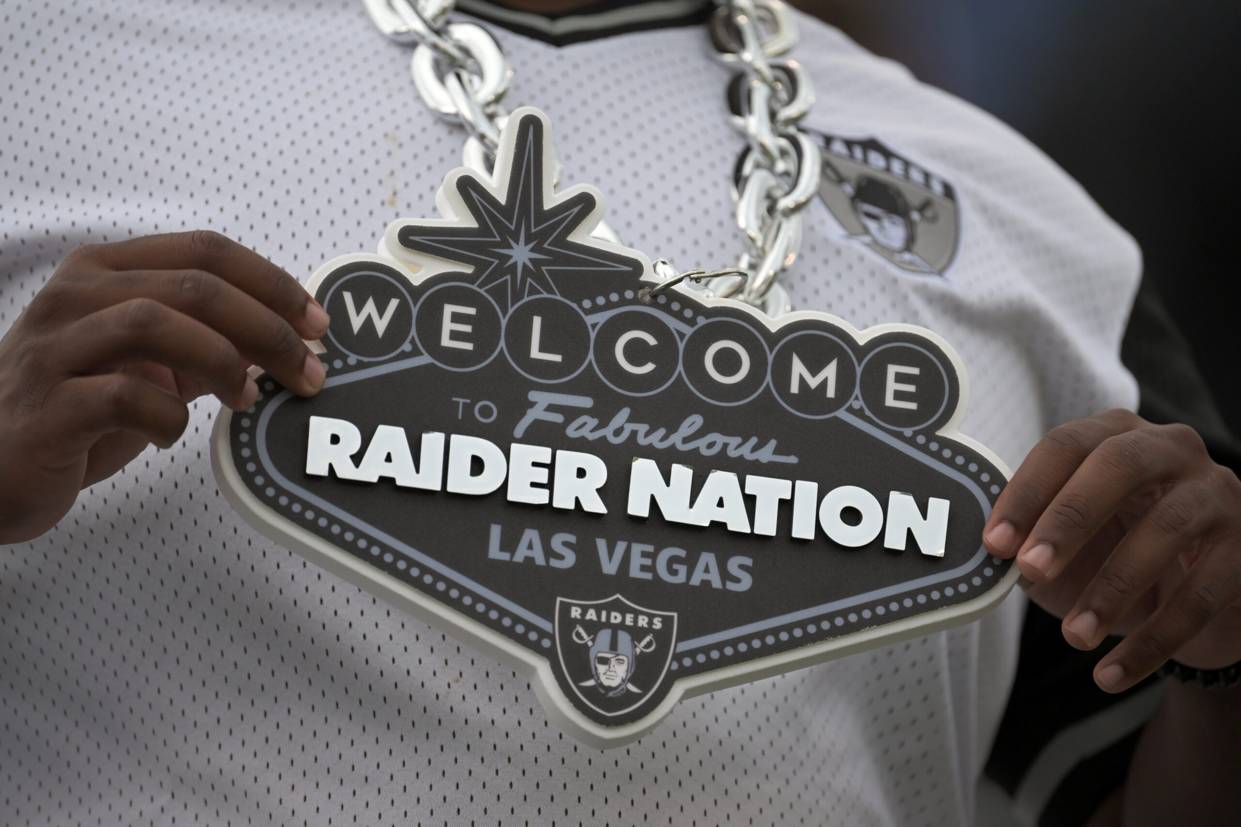 Aug 4, 2022; Canton, Ohio, USA; A Las Vegas Raiders fan holds up his Raider Nation necklace before the NFL Hall of Fame game against the Jacksonville Jaguars at Tom Benson Hall of Fame Stadium. Mandatory Credit: Ken Blaze-Imagn Images