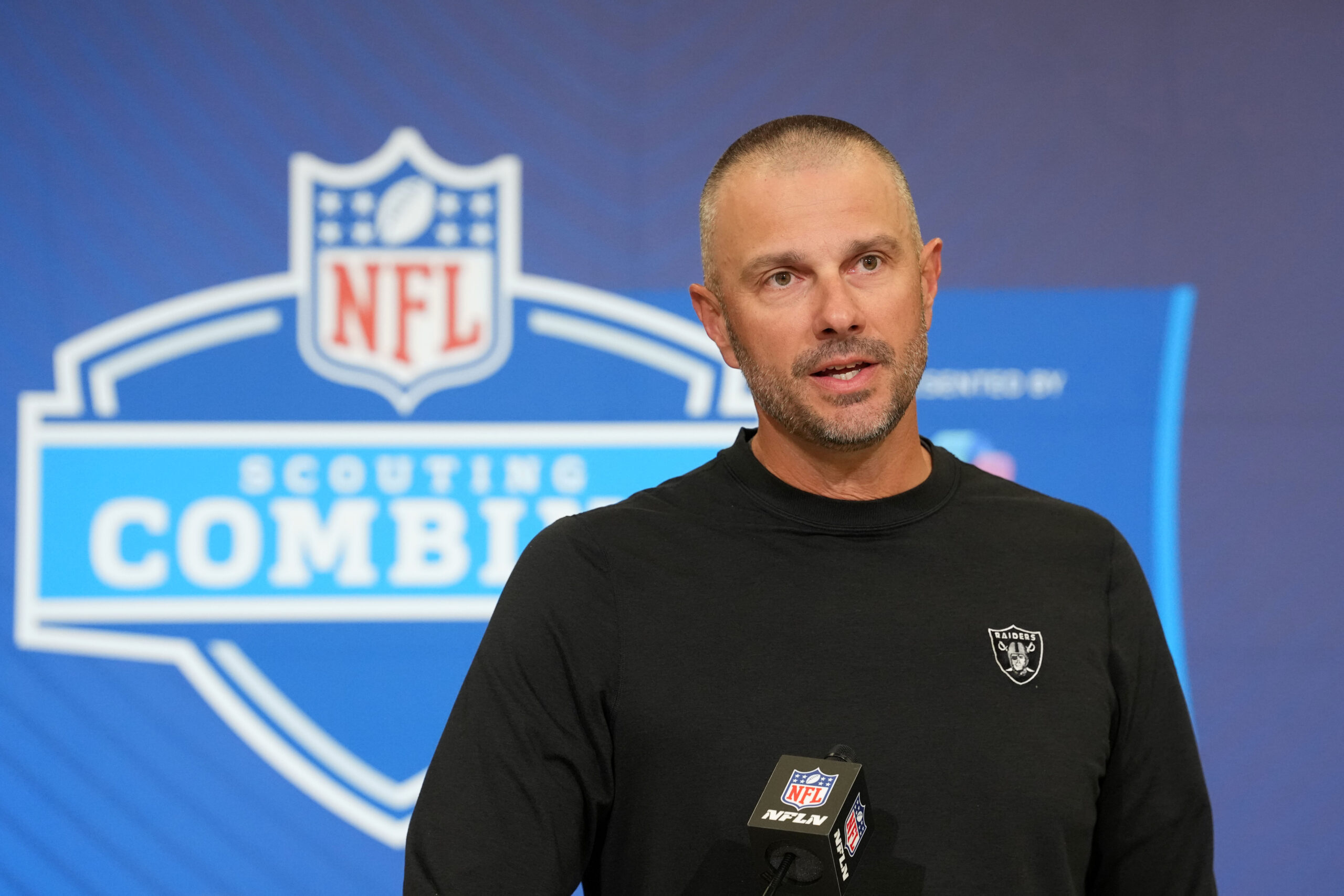 Feb 24, 2026; Indianapolis, IN, USA; Las Vegas Raiders general manager John Spytek speaks at the NFL Scouting Combine at the Indiana Convention Center. Mandatory Credit: Kirby Lee-Imagn Images