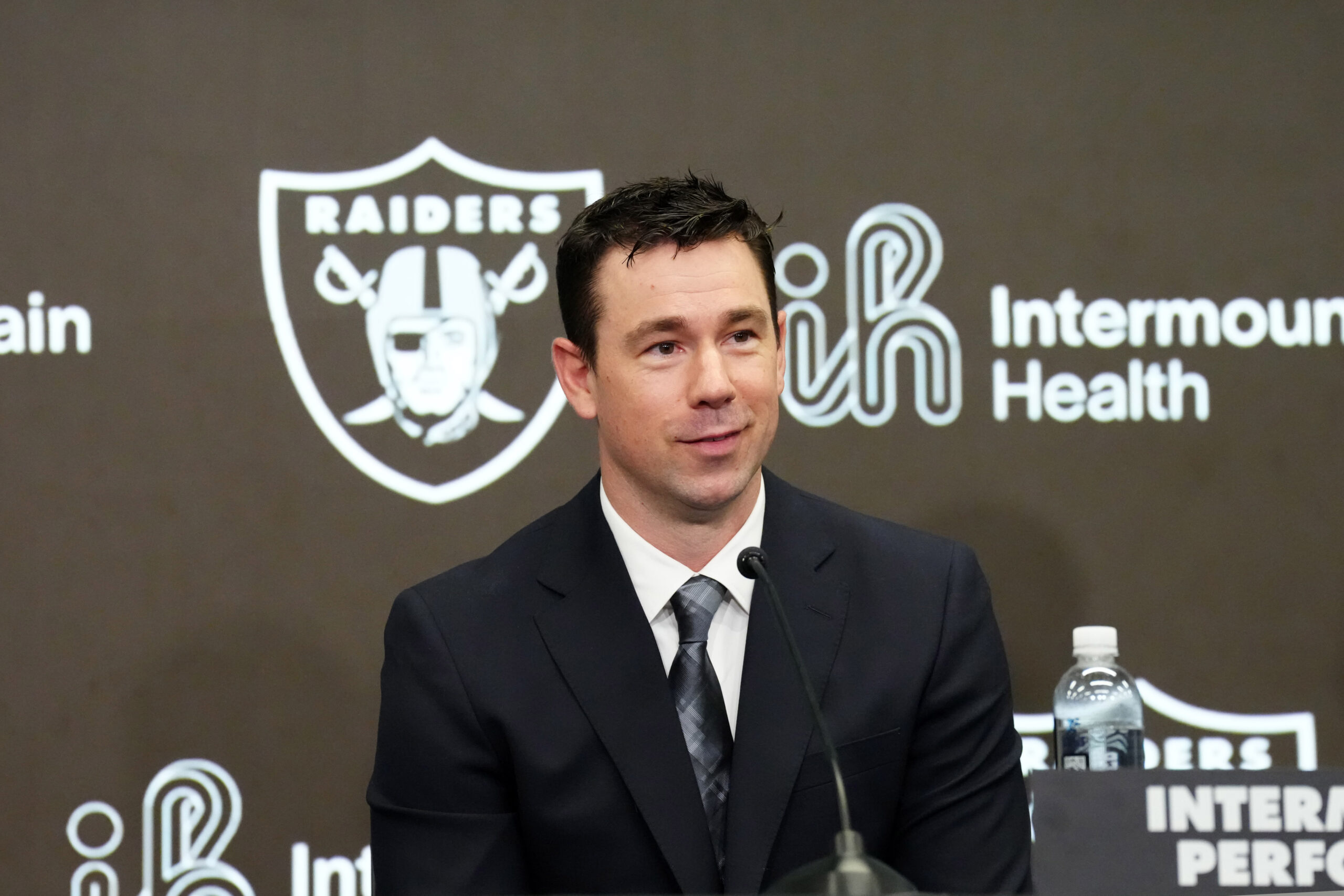 Feb 10, 2026; Henderson, NV, USA; Las Vegas Raiders coach Klint Kubiak speaks at introductory press conference at Intermountain Health Performance Center. Mandatory Credit: Kirby Lee-Imagn Images