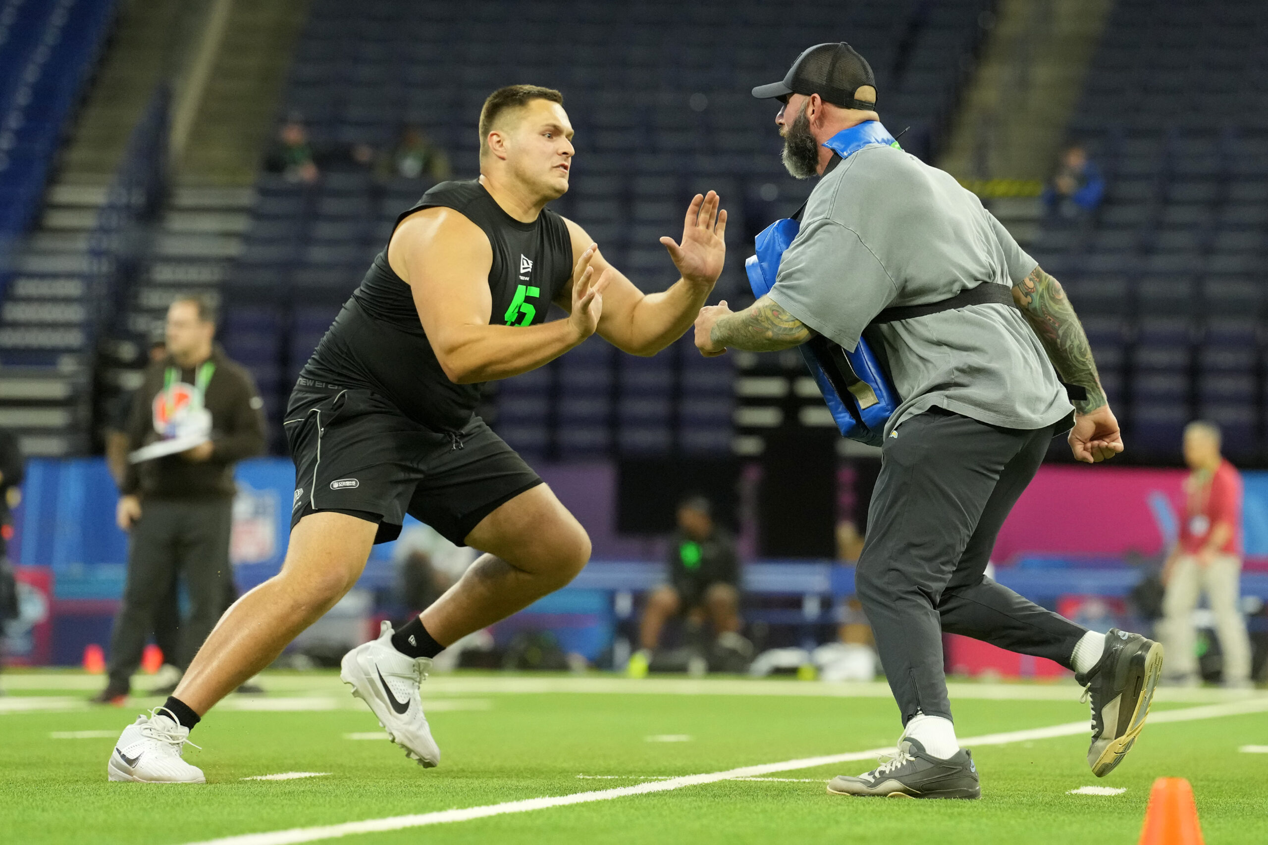 Mar 1, 2026; Indianapolis, IN, USA; Notre Dame offensive lineman Billy Schrauth (OL45) during the NFL Scouting Combine at Lucas Oil Stadium. Mandatory Credit: Kirby Lee-Imagn Images