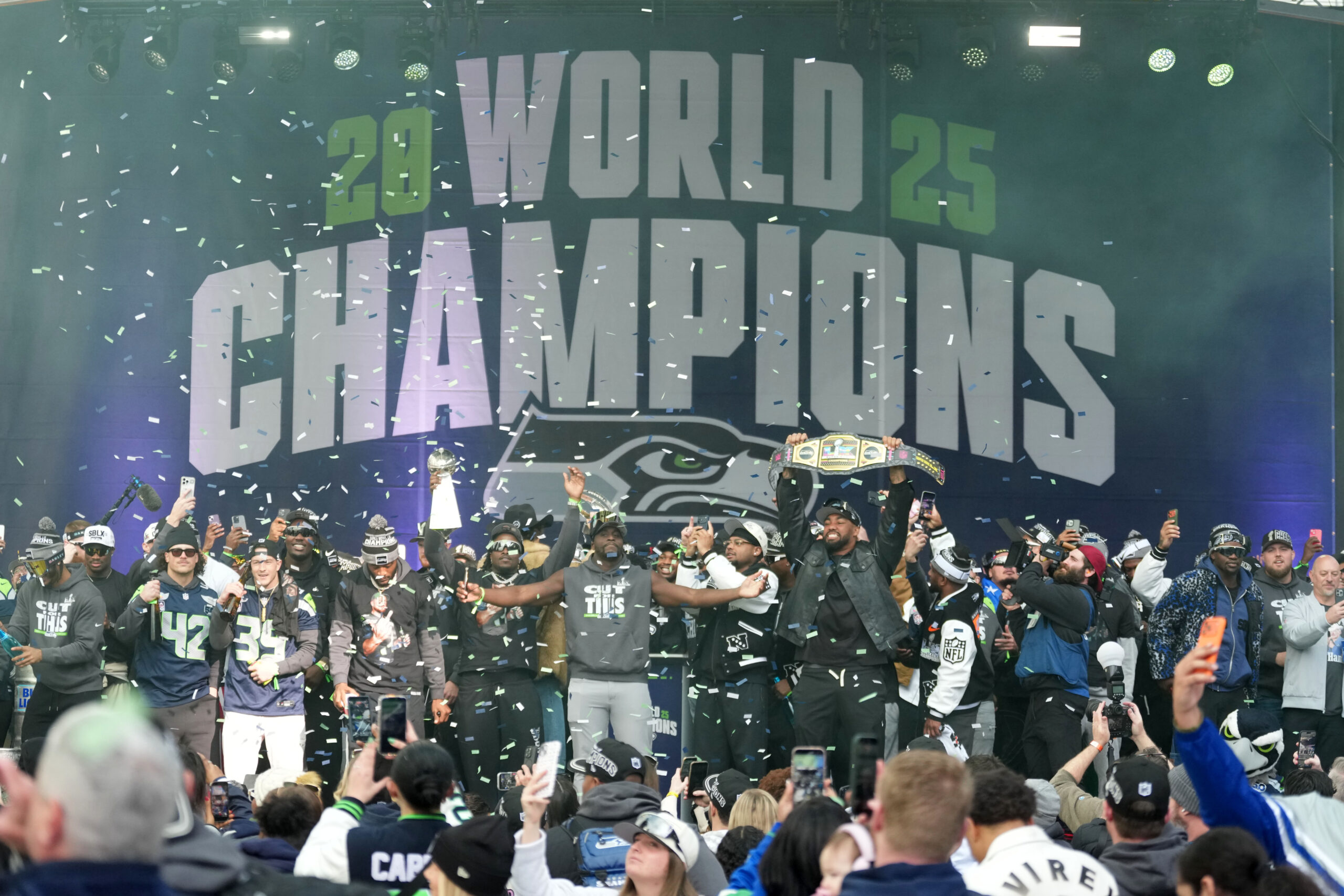 Feb 11, 2026; Seattle, WA, USA; Seattle Seahawks players react during the Super Bowl LX trophy celebration at Lumen Field. Mandatory Credit: Kirby Lee-Imagn Images