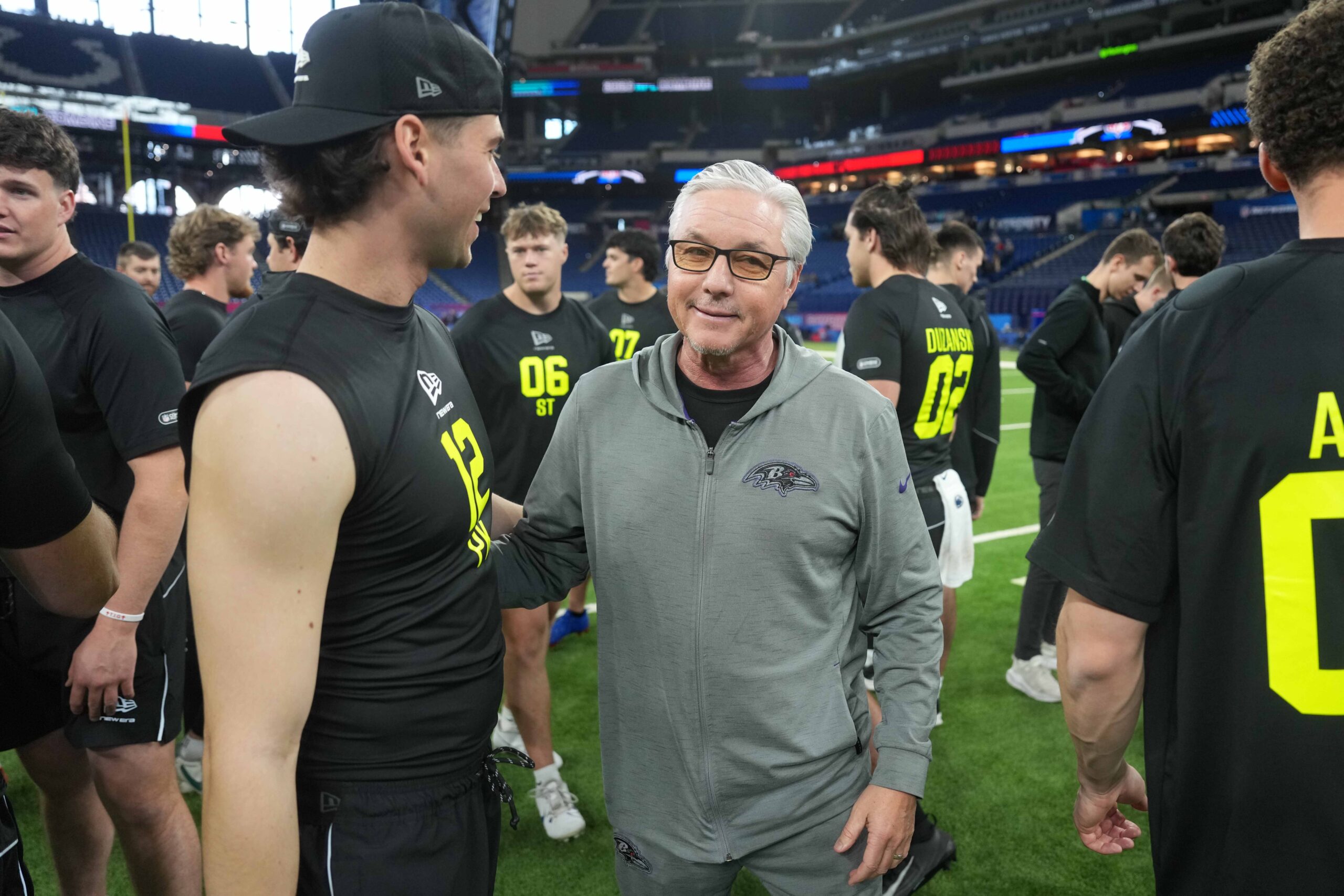 Feb 25, 2026; Indianapolis, IN, USA; Baltimore Ravens senior special teams coach Randy Brown with Western Kentucky place kicker Cole Maynard (PK12) during the NFL Scouting Combine at Lucas Oil Stadium. Mandatory Credit: Kirby Lee-Imagn Images