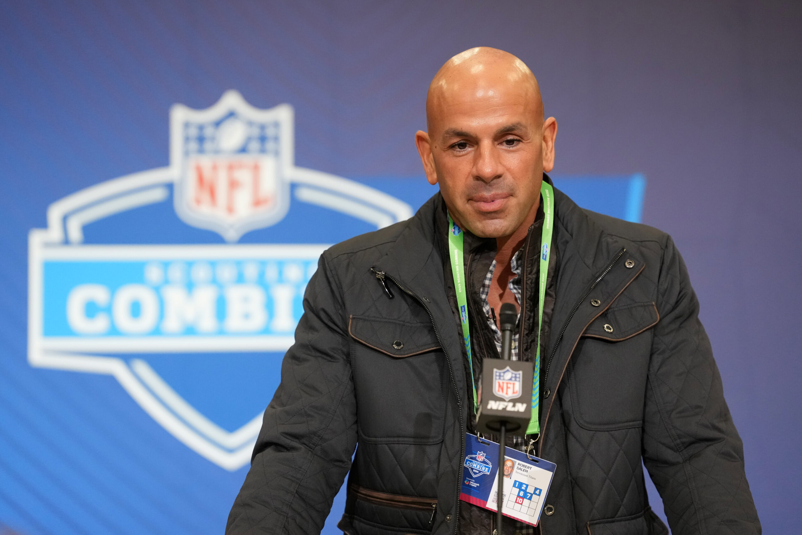 Feb 24, 2026; Indianapolis, IN, USA; Tennessee Titans coach Robert Saleh speaks at the NFL Scouting Combine at the Indiana Convention Center. Mandatory Credit: Kirby Lee-Imagn Images