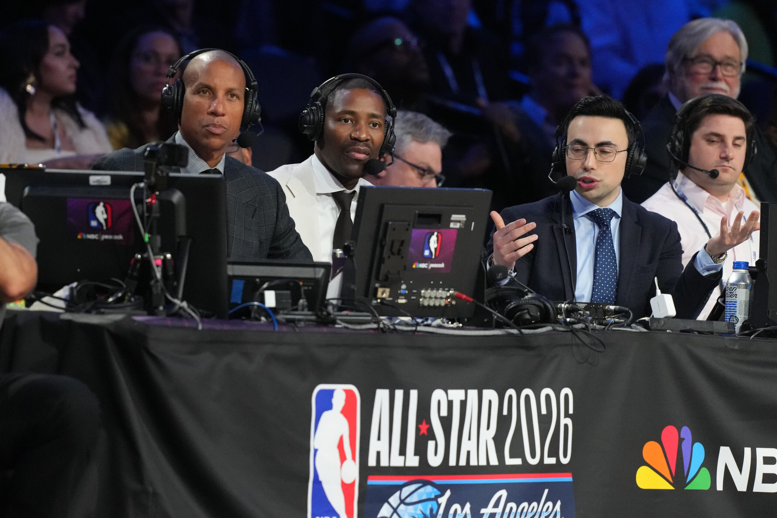 Feb 15, 2026; Inglewood, California, USA; NBC Peacock analysts Reggie Miller (left) and Jamal Crawford (center) and play-by-play announcer Noah Eagle watch during the 75th NBA All Star Game at Intuit Dome. Mandatory Credit: Kirby Lee-Imagn Images