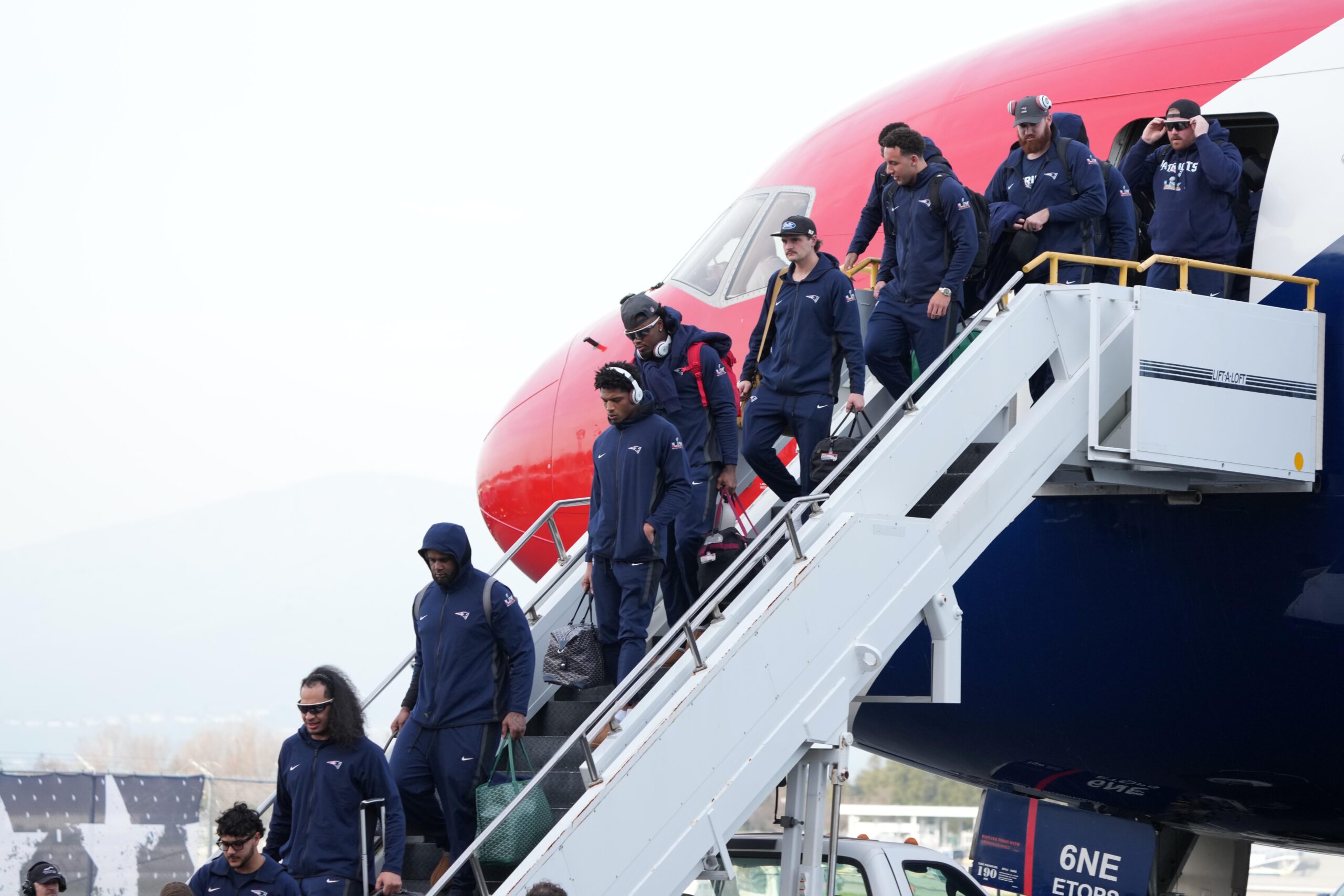 Feb 1, 2026; Santa Clara, CA, USA; New England Patriots players arrive prior to Super Bowl LX at San Jose Mineta International Airport. Mandatory Credit: Kirby Lee-Imagn Images