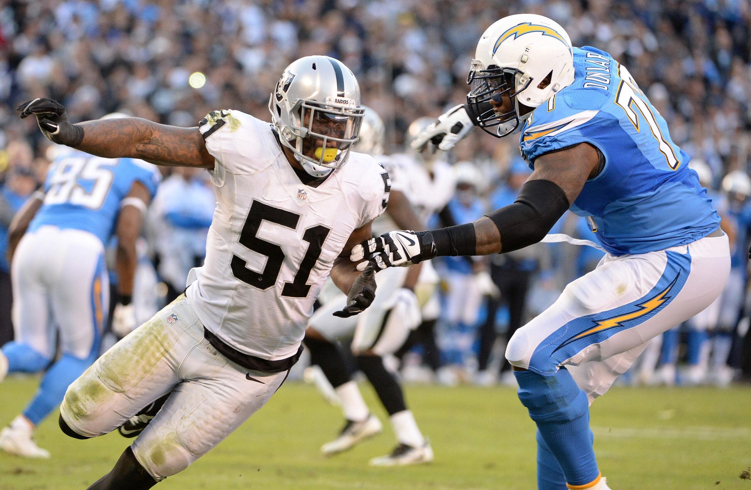 Dec 18, 2016; San Diego, CA, USA; San Diego Chargers tackle King Dunlap (77) blocks Oakland Raiders outside linebacker Bruce Irvin (51) during the second half of the game at Qualcomm Stadium. The Raiders won 19-16. Mandatory Credit: Orlando Ramirez-Imagn Images