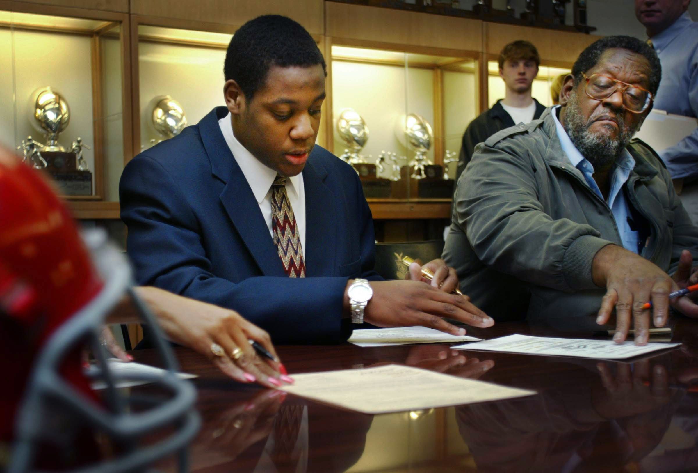 Brentwood Academy standout lineman King Dunlap, left, signs his letter of intent to play football for Auburn University with is father, King Dunlap IV, right, at his side at the school Feb. 5, 2003.