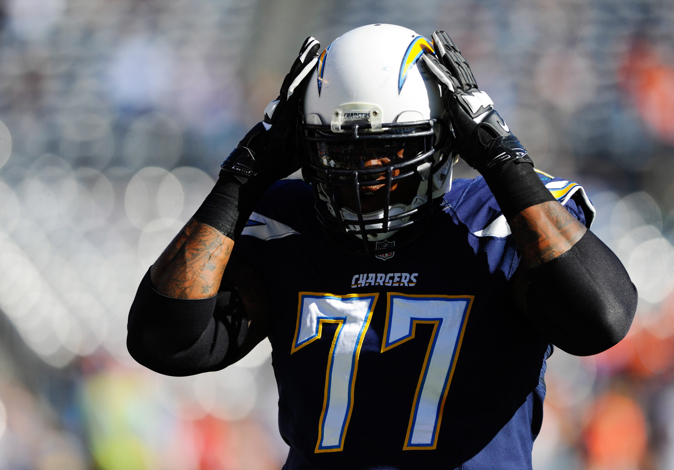 Nov 10, 2013; San Diego, CA, USA; San Diego Chargers offensive tackle King Dunlap (77) prior to the game against the Denver Broncos at Qualcomm Stadium. Mandatory Credit: Christopher Hanewinckel-Imagn Images