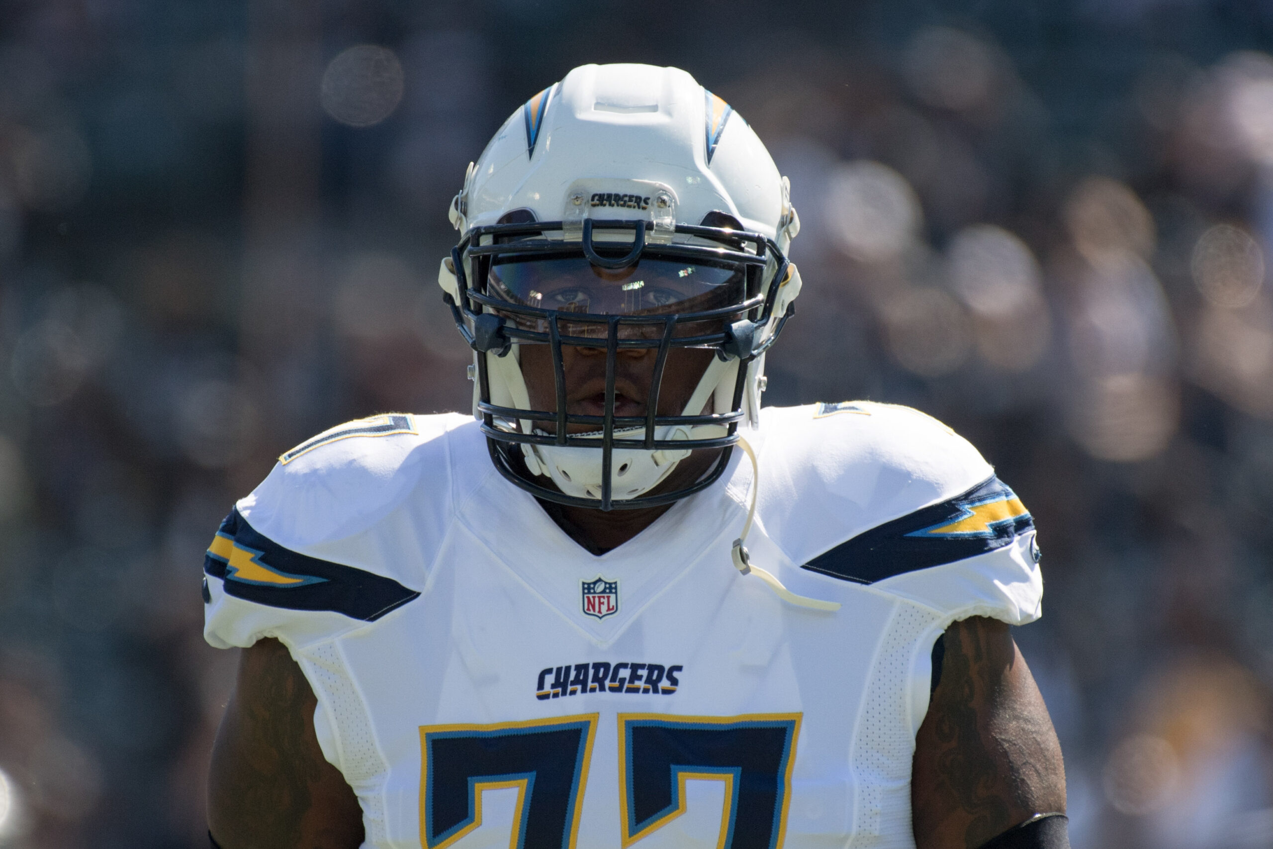 October 9, 2016; Oakland, CA, USA; San Diego Chargers tackle King Dunlap (77) before the game against the Oakland Raiders at Oakland Coliseum. The Raiders defeated the Chargers 34-31. Mandatory Credit: Kyle Terada-Imagn Images