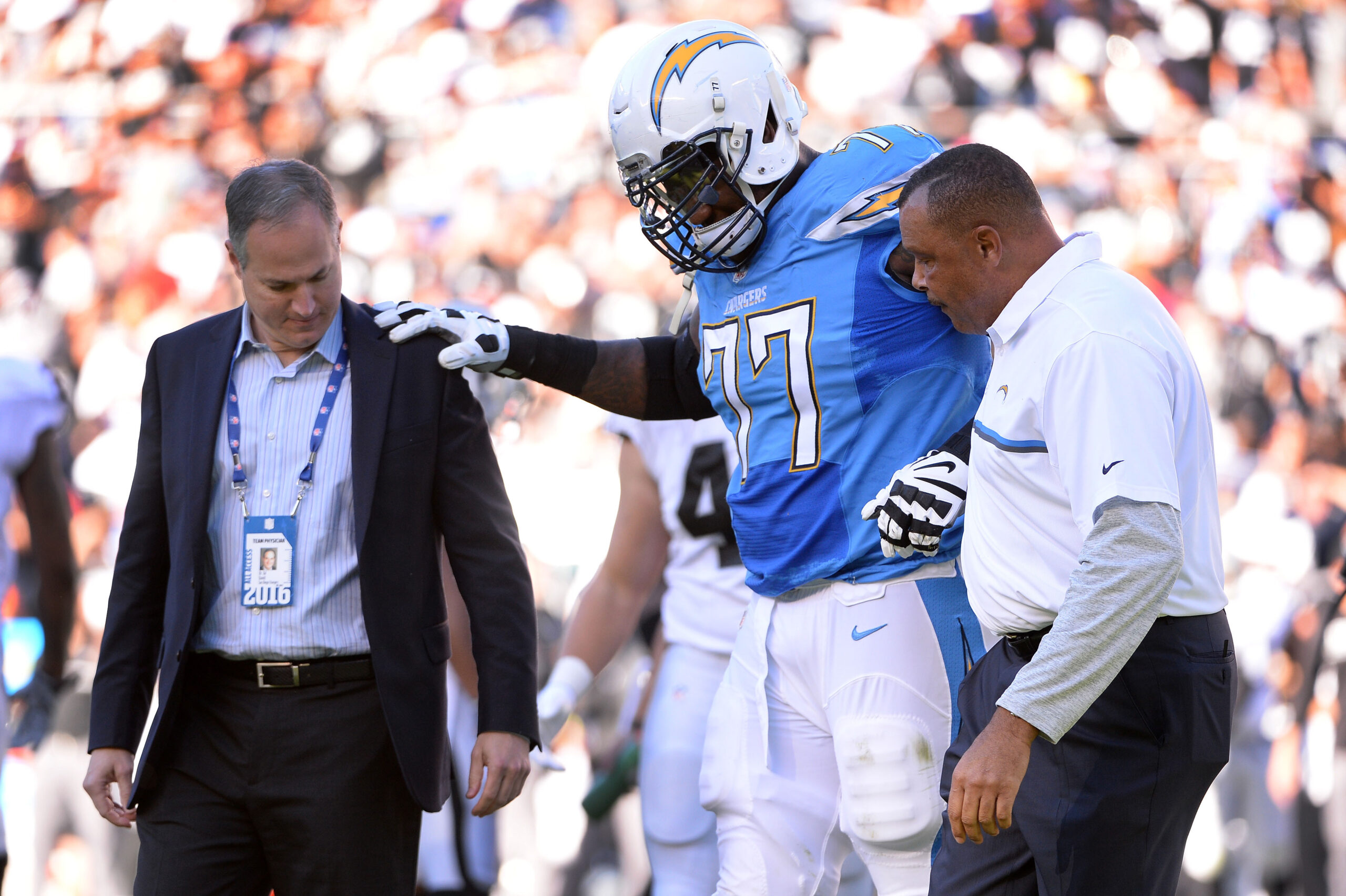 Dec 18, 2016; San Diego, CA, USA; San Diego Chargers tackle King Dunlap (77) walks off the field with assistance following an injury during the second quarter of the game against the Oakland Raiders at Qualcomm Stadium. Mandatory Credit: Orlando Ramirez-Imagn Images