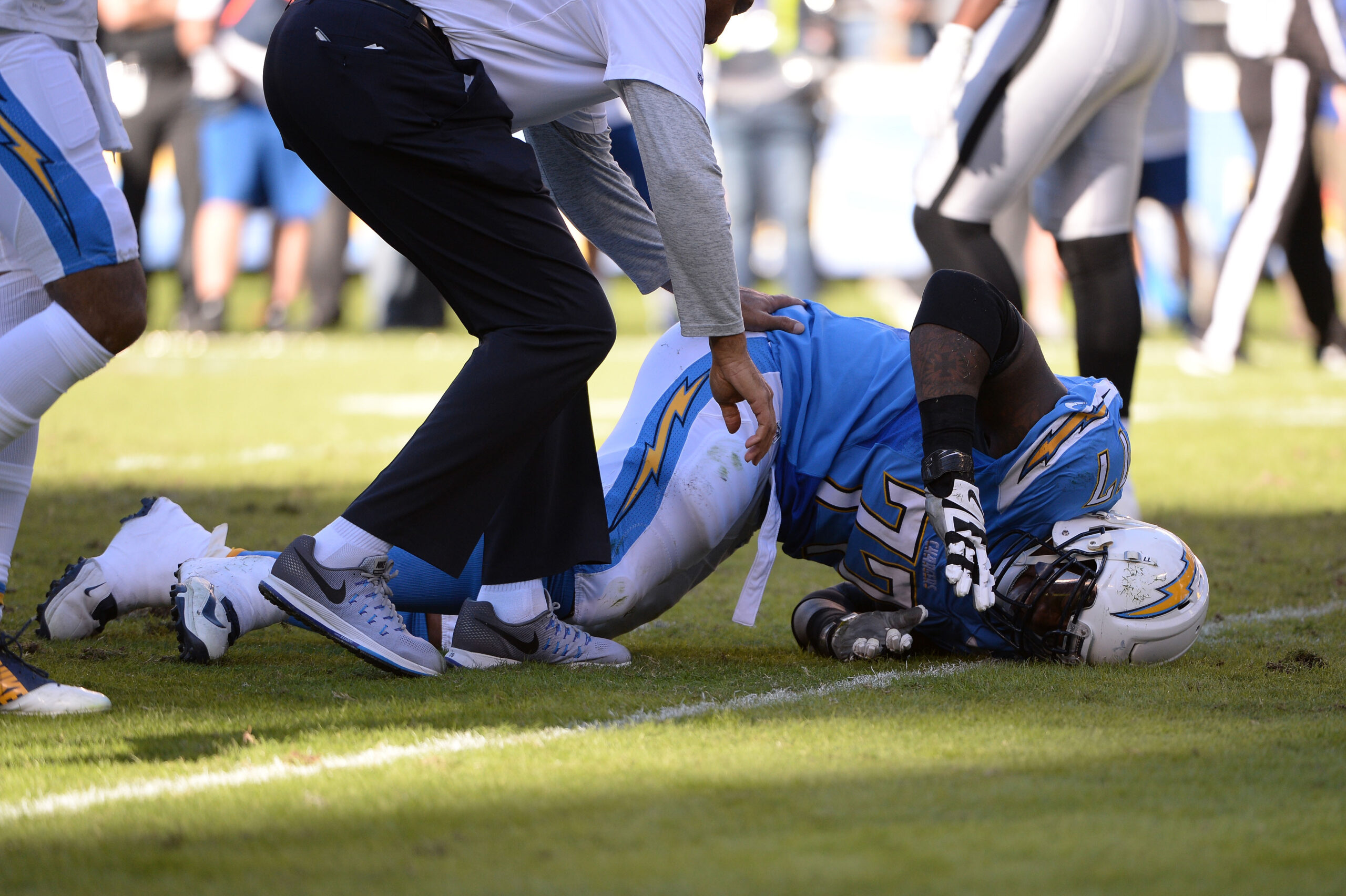 Dec 18, 2016; San Diego, CA, USA; San Diego Chargers tackle King Dunlap (77) lays on the ground due to an injury during the second quarter of the game against the Oakland Raiders at Qualcomm Stadium. Mandatory Credit: Orlando Ramirez-Imagn Images