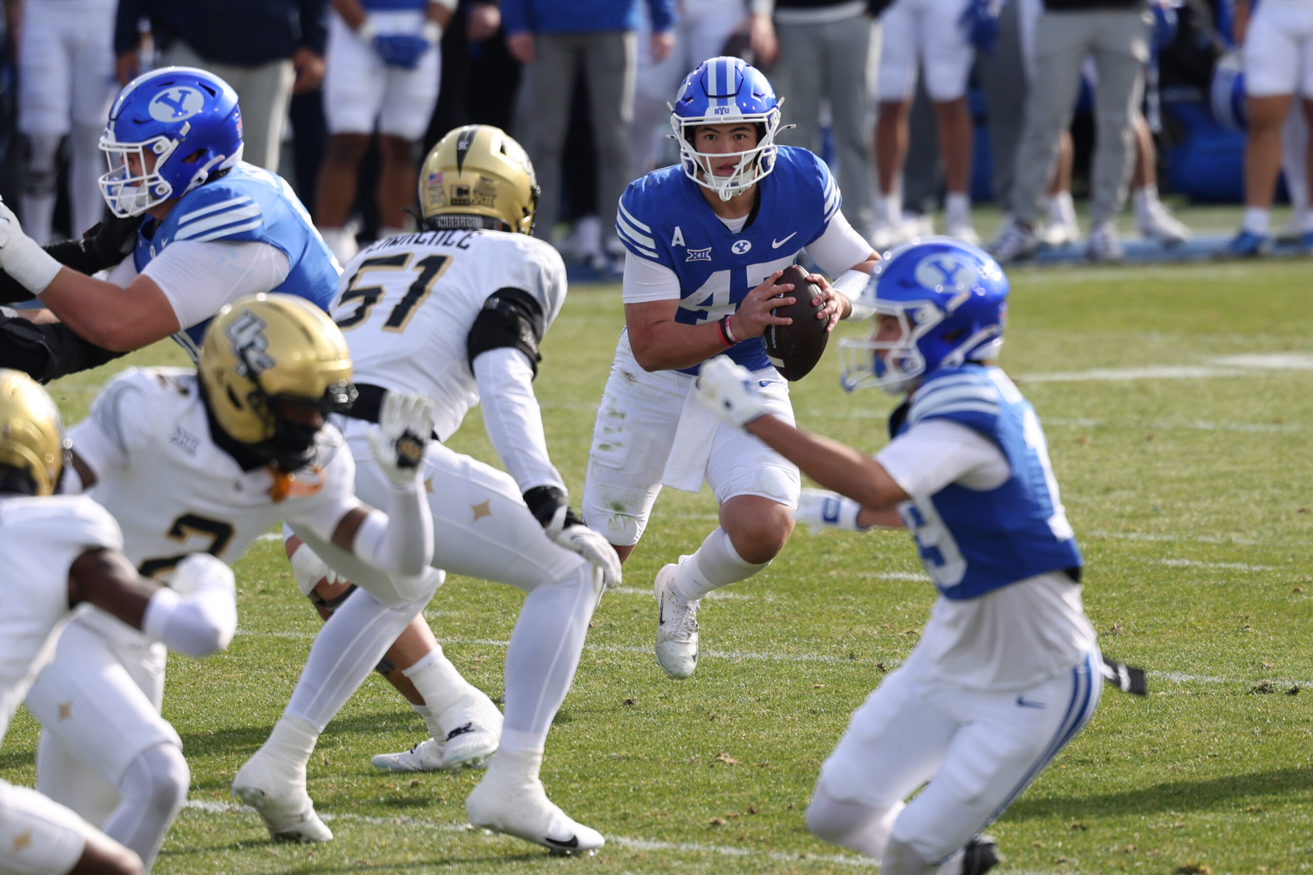 Nov 29, 2025; Provo, Utah, USA; BYU Cougars quarterback Bear Bachmeier (47) runs the ball against UCF Knights defensive end Malachi Lawrence (51) during the second quarter at LaVell Edwards Stadium. Mandatory Credit: Rob Gray-Imagn Images