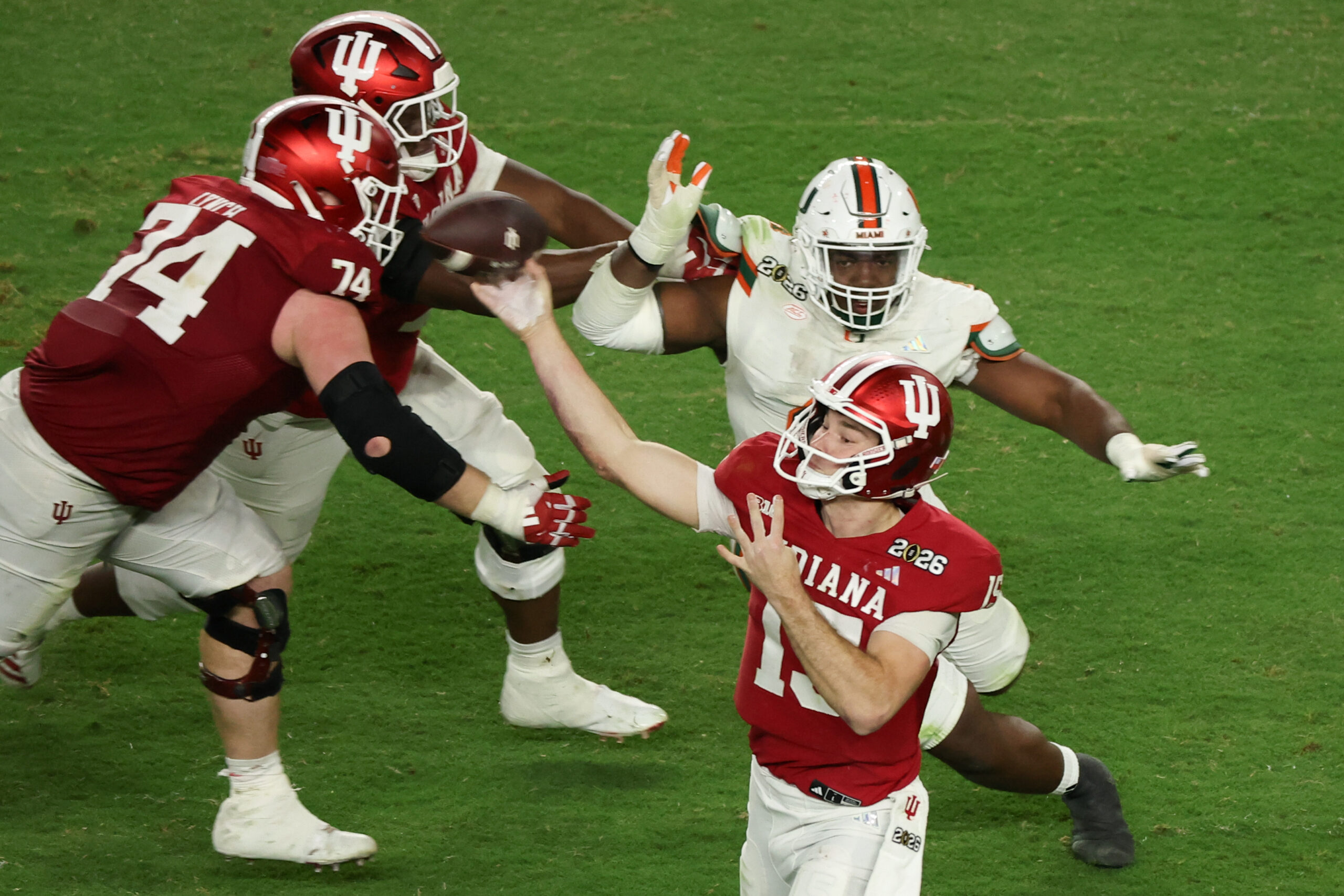 Jan 19, 2026; Miami Gardens, FL, USA; Indiana Hoosiers quarterback Fernando Mendoza (15) passes the ball under pressure by Miami Hurricanes defensive lineman Rueben Bain Jr. (4) in the third quarter during the College Football Playoff National Championship game at Hard Rock Stadium. Mandatory Credit: Kim Klement Neitzel-Imagn Images
