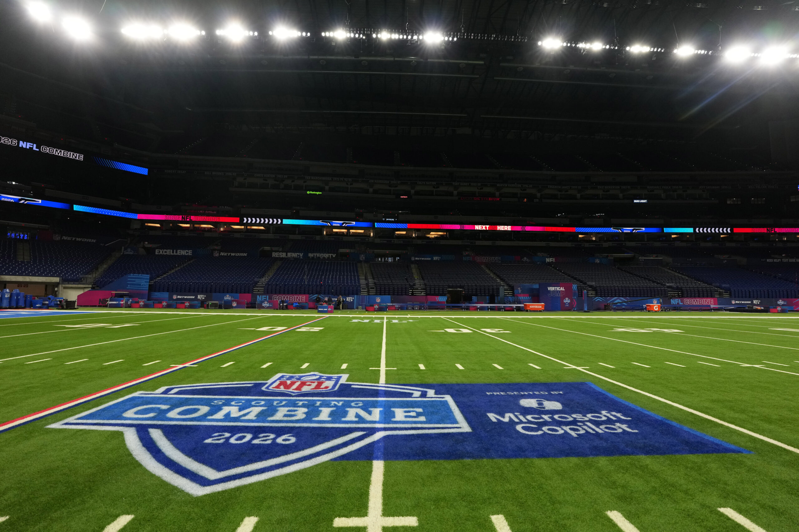 Feb 24, 2026; Indianapolis, IN, USA; The 2026 NFL Scouting Combine logo on the field at Lucas Oil Stadium. Mandatory Credit: Kirby Lee-Imagn Images
