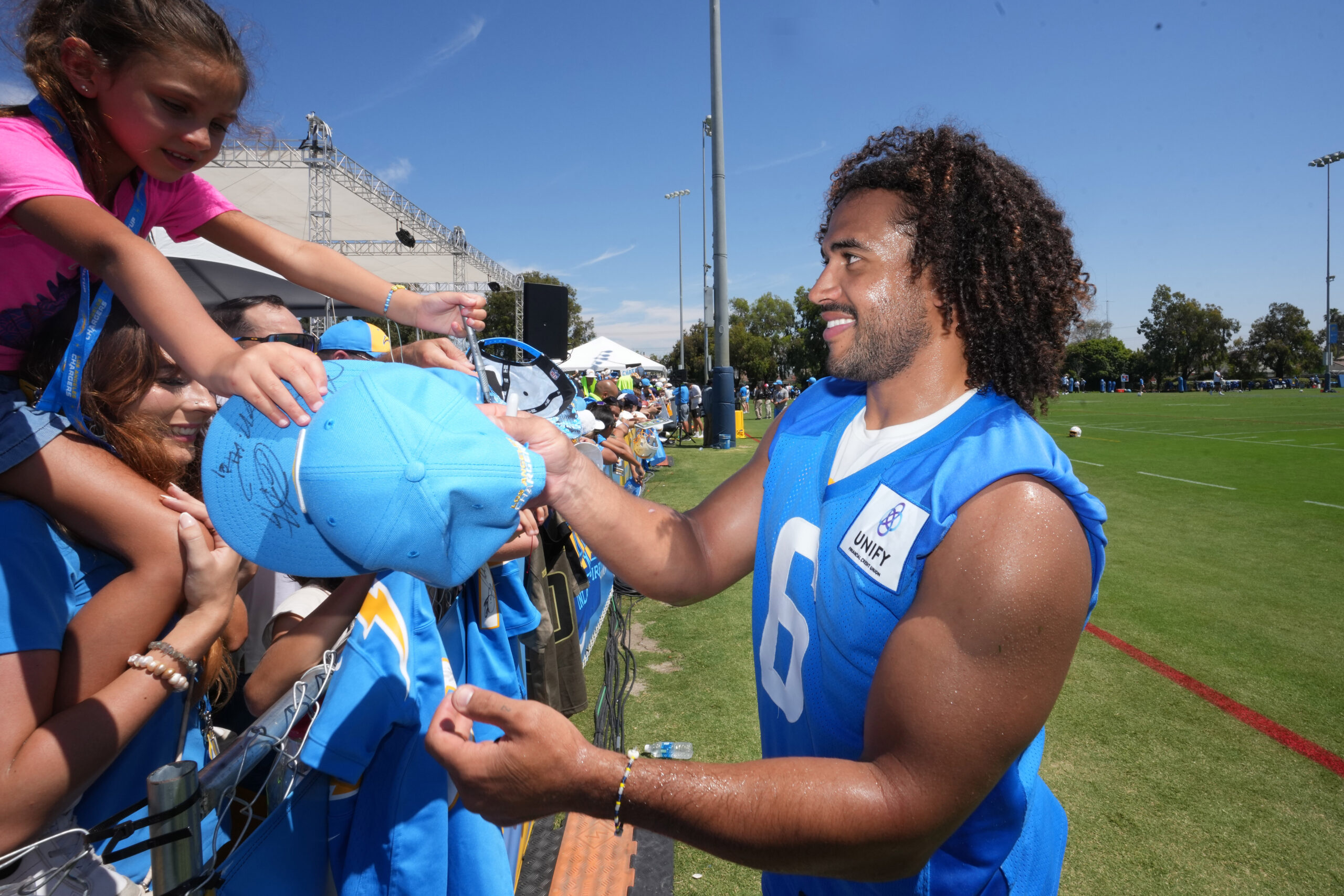 Jul 26, 2023; Costa Mesa, CA, USA; Los Angeles Chargers linebacker Eric Kendricks (6) signs autographs during training camp at Jack Hammett Sports Complex. Mandatory Credit: Kirby Lee-Imagn Images