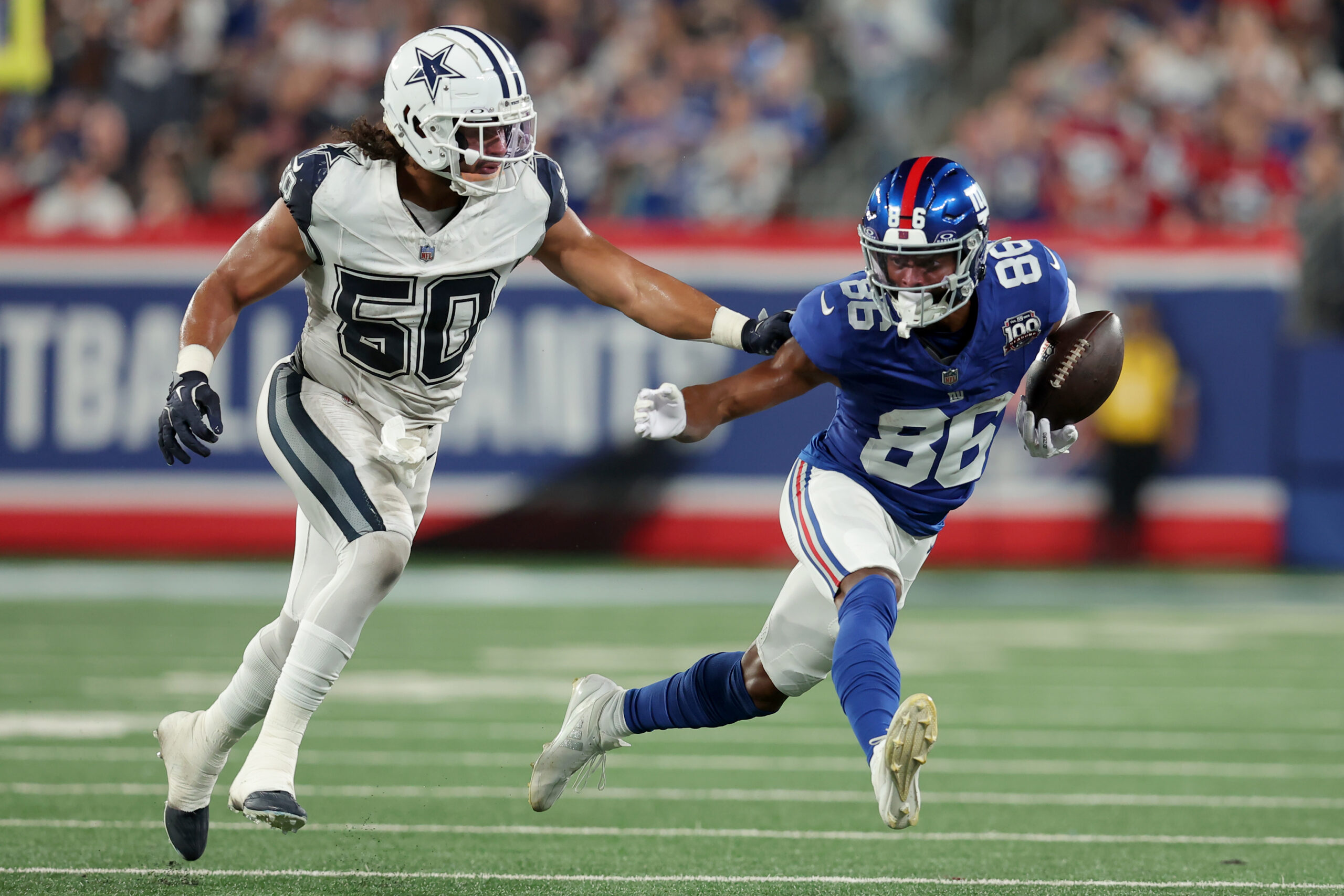 Sep 26, 2024; East Rutherford, NJ, US; New York Giants wide receiver Darius Slayton (86) runs with the ball after a catch while being chased by Dallas Cowboys linebacker Eric Kendricks (50) at MetLife Stadium. Mandatory Credit: Julian Guadalupe-NorthJersey.com