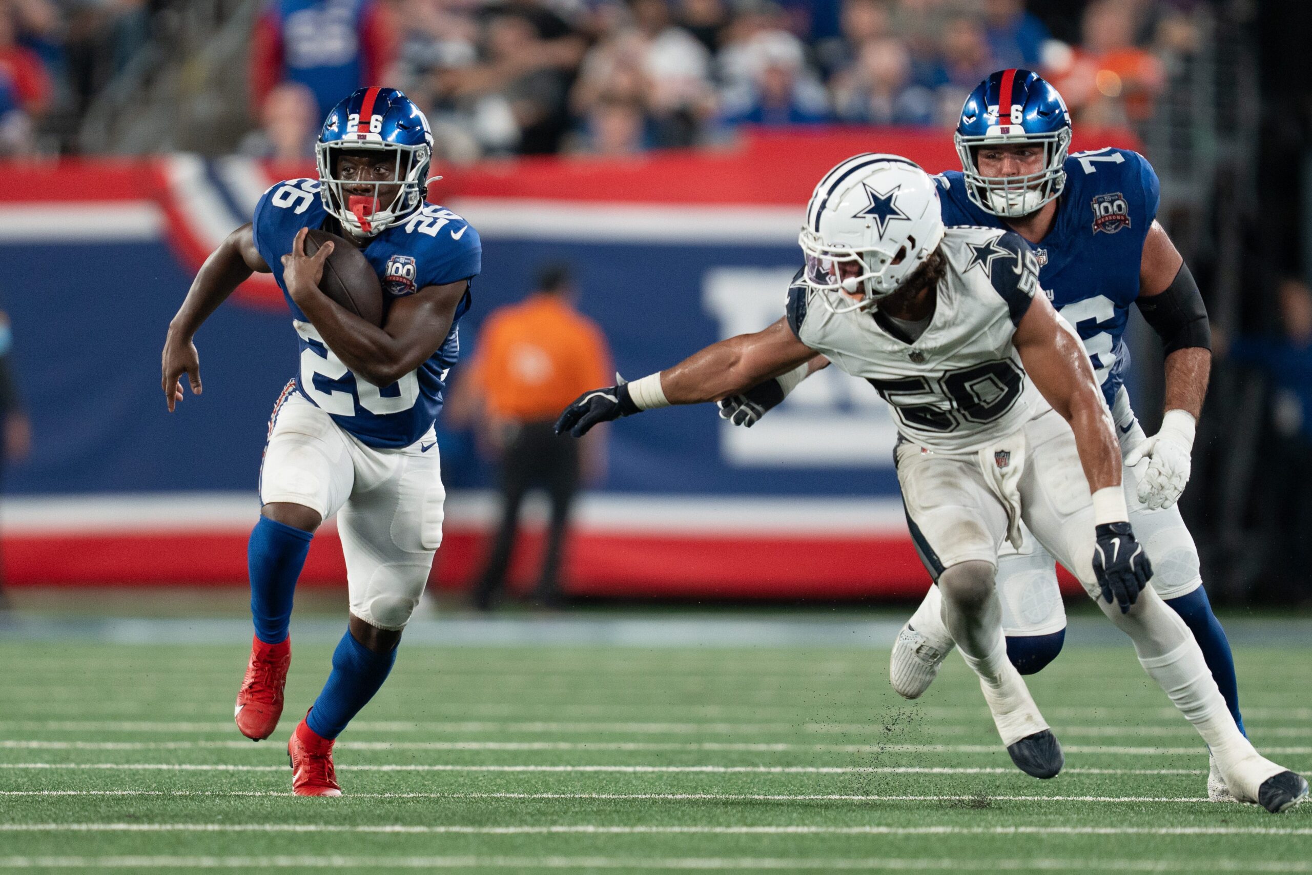 Sep 26, 2024; East Rutherford, NJ, US; New York Giants running back Eric Gray (20) runs upfield with the ball before being tackled by Dallas Cowboys linebacker Eric Kendricks (50) at MetLife Stadium. Mandatory Credit: Julian Guadalupe-NorthJersey.com