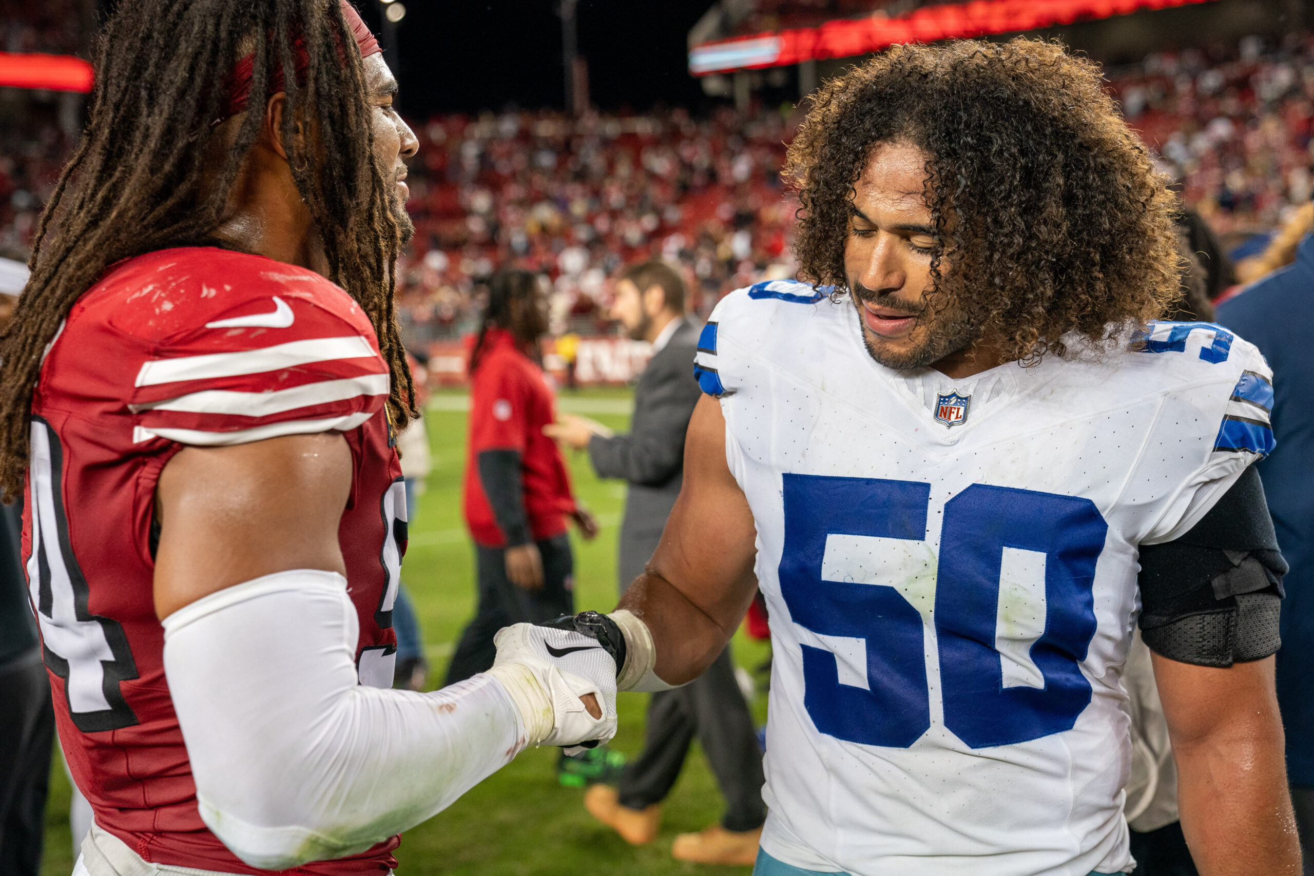 Oct 27, 2024; Santa Clara, California, USA; after the game San Francisco 49ers linebacker Fred Warner (54) and Dallas Cowboys linebacker Eric Kendricks (50) shake hands at Levi’s Stadium. Mandatory Credit: Neville E. Guard-Imagn Images