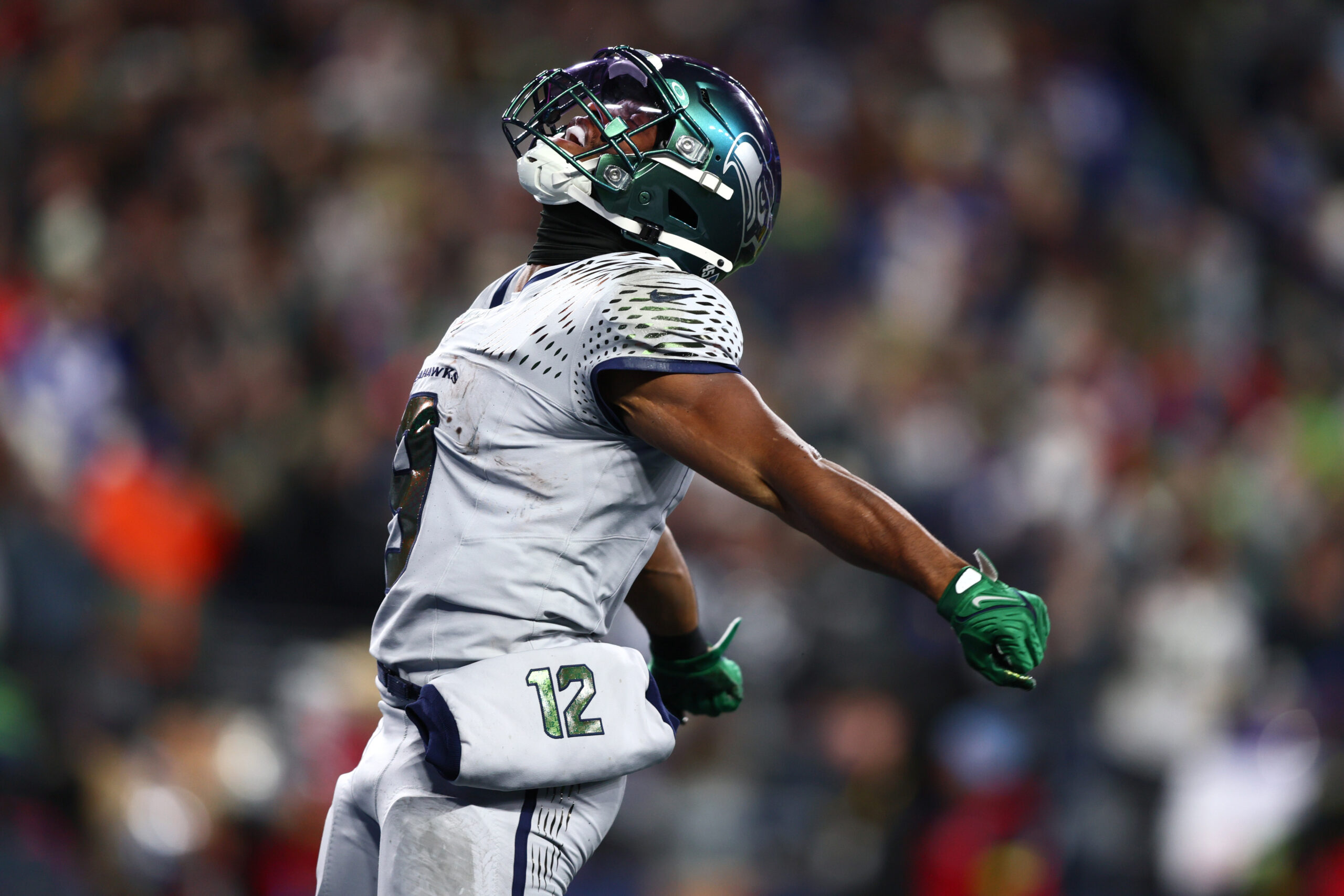 Dec 18, 2025; Seattle, Washington, USA; Seattle Seahawks running back Kenneth Walker III (9) reacts after a first down against the Los Angeles Rams in the first half at Lumen Field. Mandatory Credit: Kevin Ng-Imagn Images