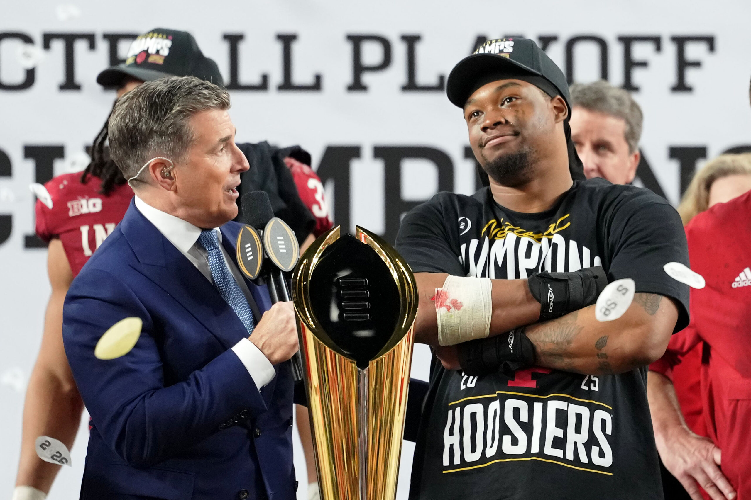 Jan 19, 2026; Miami Gardens, FL, USA; ESPN personality Rece Davis interviews Indiana Hoosiers defensive lineman Mikail Kamara (6) after winning the College Football Playoff National Championship game at Hard Rock Stadium. Mandatory Credit: Kirby Lee-Imagn Images