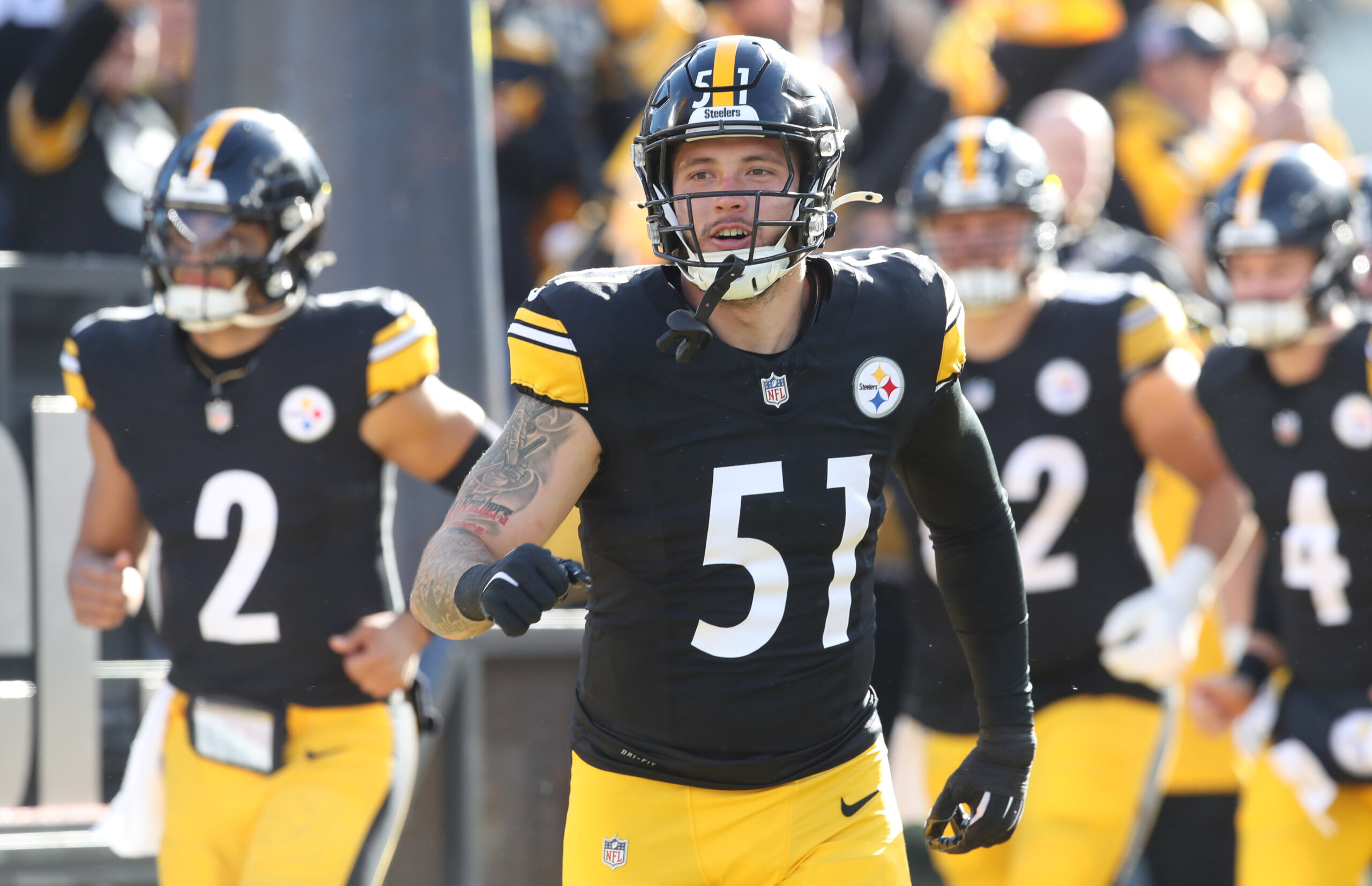 Dec 8, 2024; Pittsburgh, Pennsylvania, USA; Pittsburgh Steelers linebacker Nick Herbig (51) takes the field against the Cleveland Browns at Acrisure Stadium. Mandatory Credit: Charles LeClaire-Imagn Images