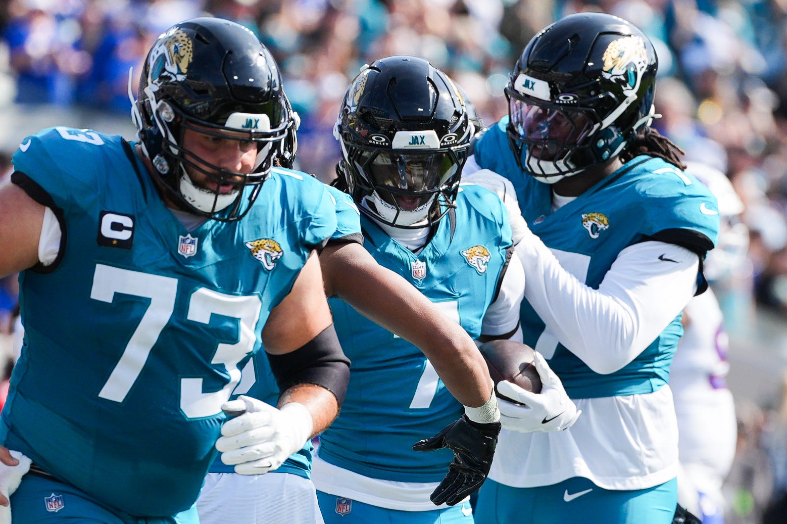 Jacksonville Jaguars wide receiver Brian Thomas Jr. (7) is congratulated buy teammates after scoring a touchdown during the first quarter in an NFL football AFC Wild Card playoff matchup, Sunday, Jan. 11, 2026, in Jacksonville, Fla. Bills lead 10-7 at the half over the Jaguars. [Doug Engle/Florida Times-Union]