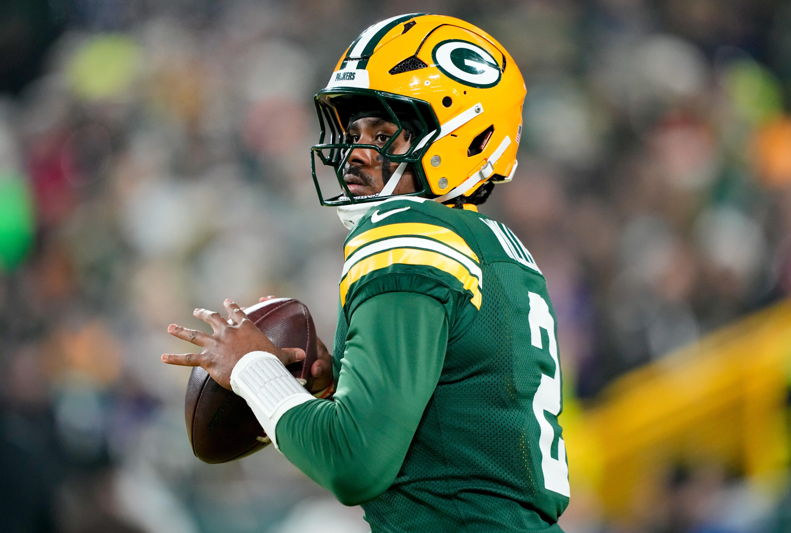 Dec 27, 2025; Green Bay, Wisconsin, USA; Green Bay Packers quarterback Malik Willis (2) warms up prior to the game against the Baltimore Ravens at Lambeau Field. Mandatory Credit: Jeff Hanisch-Imagn Images