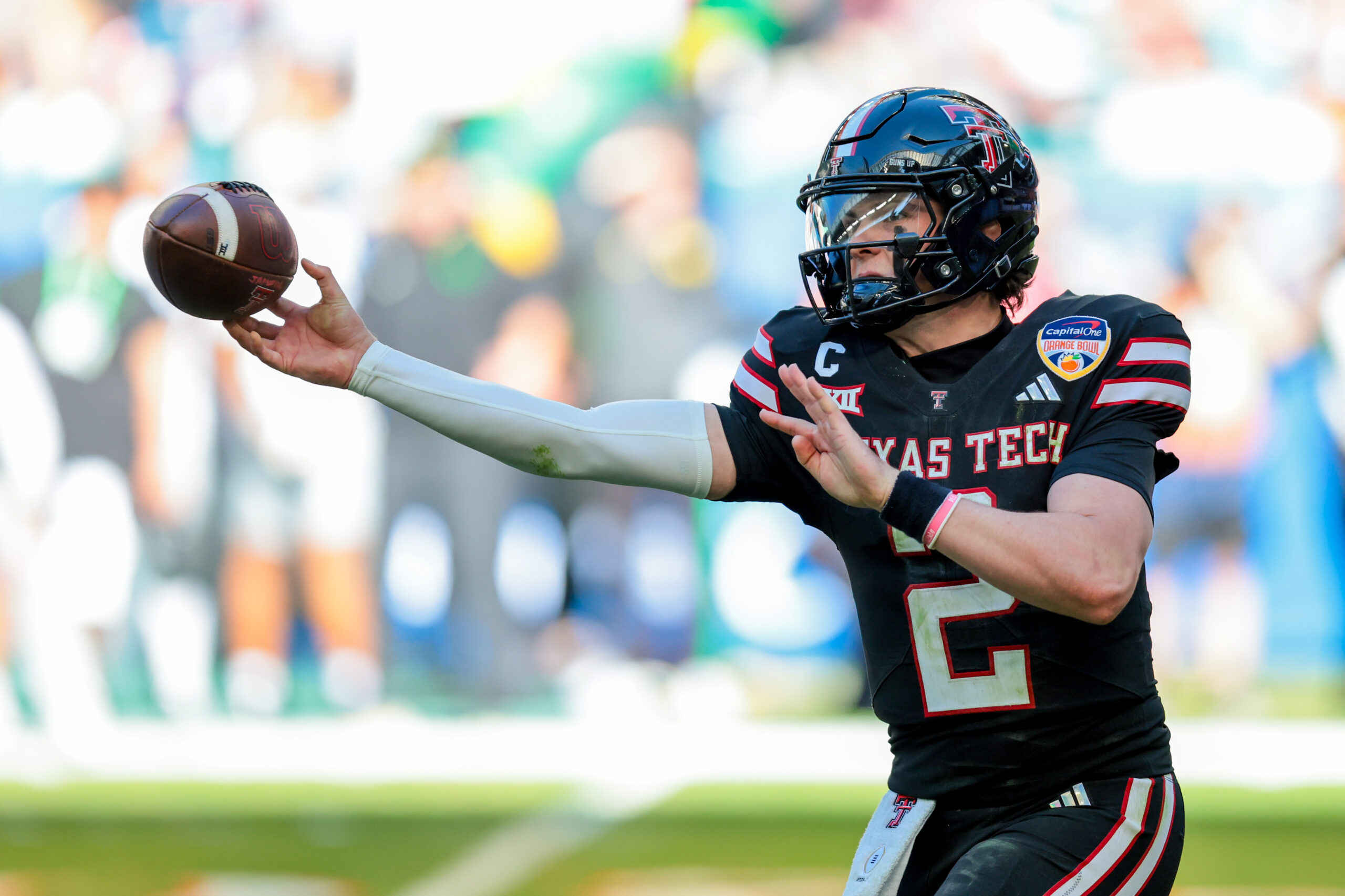 Jan 1, 2026; Miami Gardens, FL, USA; Texas Tech Red Raiders quarterback Behren Morton (2) passes the ball against the Oregon Ducks during the first half of the 2025 Orange Bowl and quarterfinal game of the College Football Playoff at Hard Rock Stadium. Mandatory Credit: Sam Navarro-Imagn Images