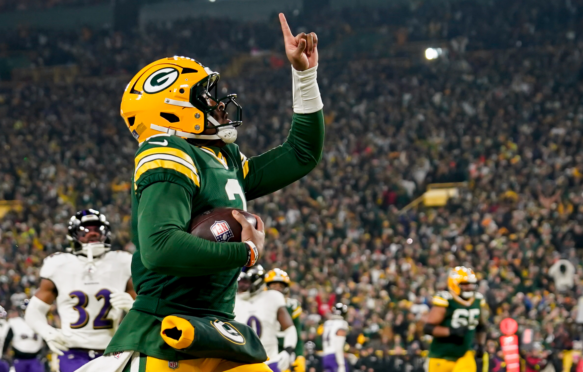 Dec 27, 2025; Green Bay, Wisconsin, USA; Green Bay Packers quarterback Malik Willis (2) celebrates after a touchdown during the second quarter against the Baltimore Ravens at Lambeau Field. Mandatory Credit: Kayla Wolf-Imagn Images