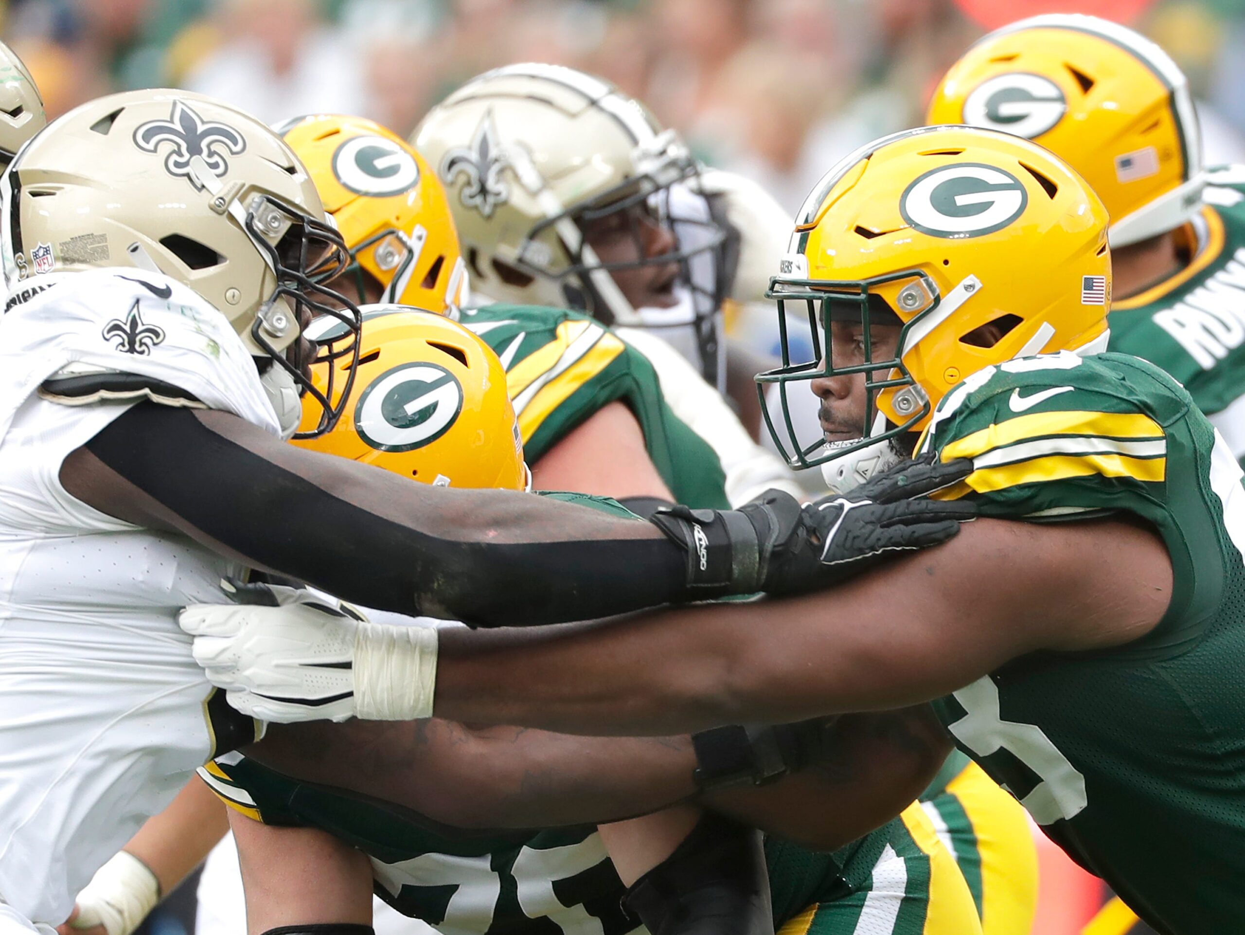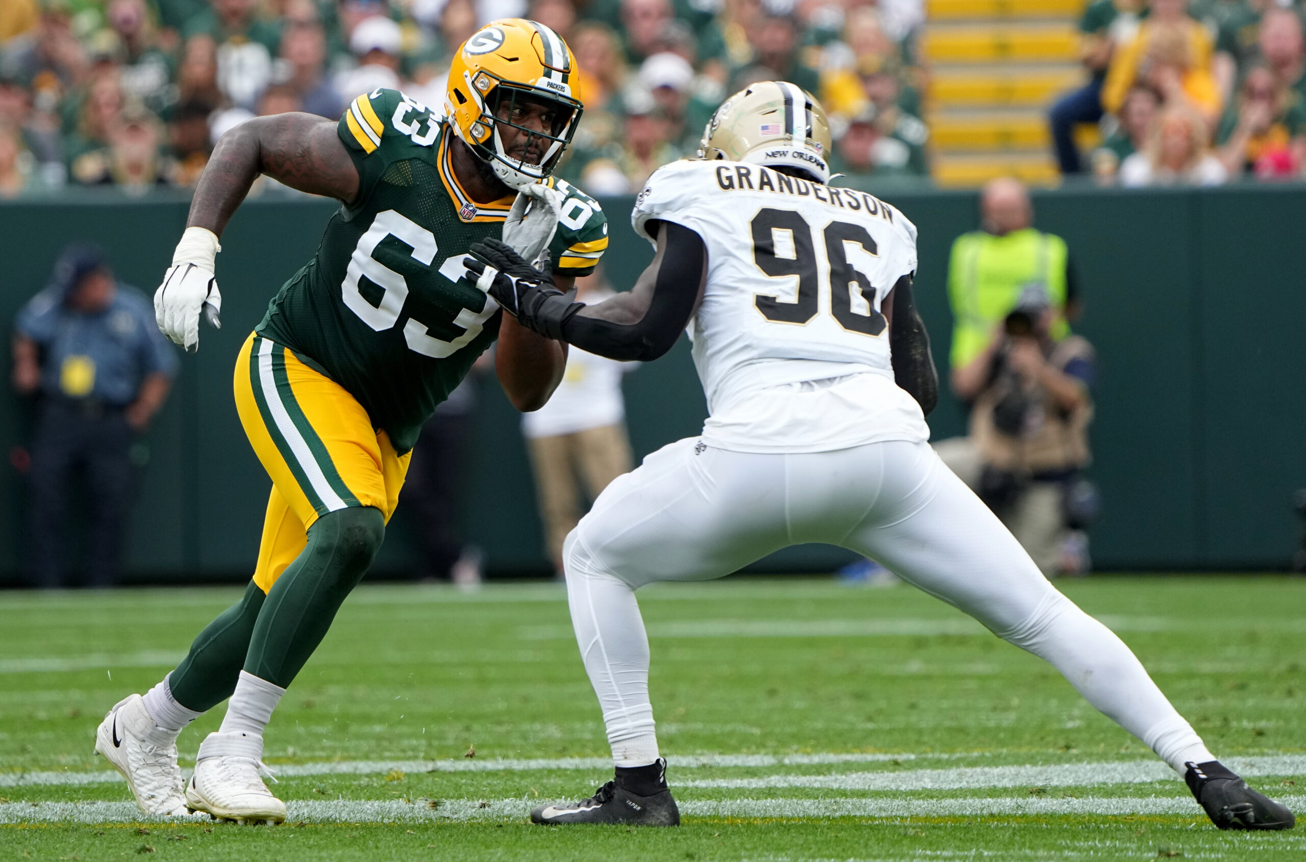 Sep 24, 2023; Green Bay, Wisconsin, USA; Green Bay Packers offensive tackle Rasheed Walker (63) blocks New Orleans Saints defensive end Carl Granderson (96) during the second quarter at Lambeau Field. Mandatory Credit: Mark Hoffman-Imagn Images