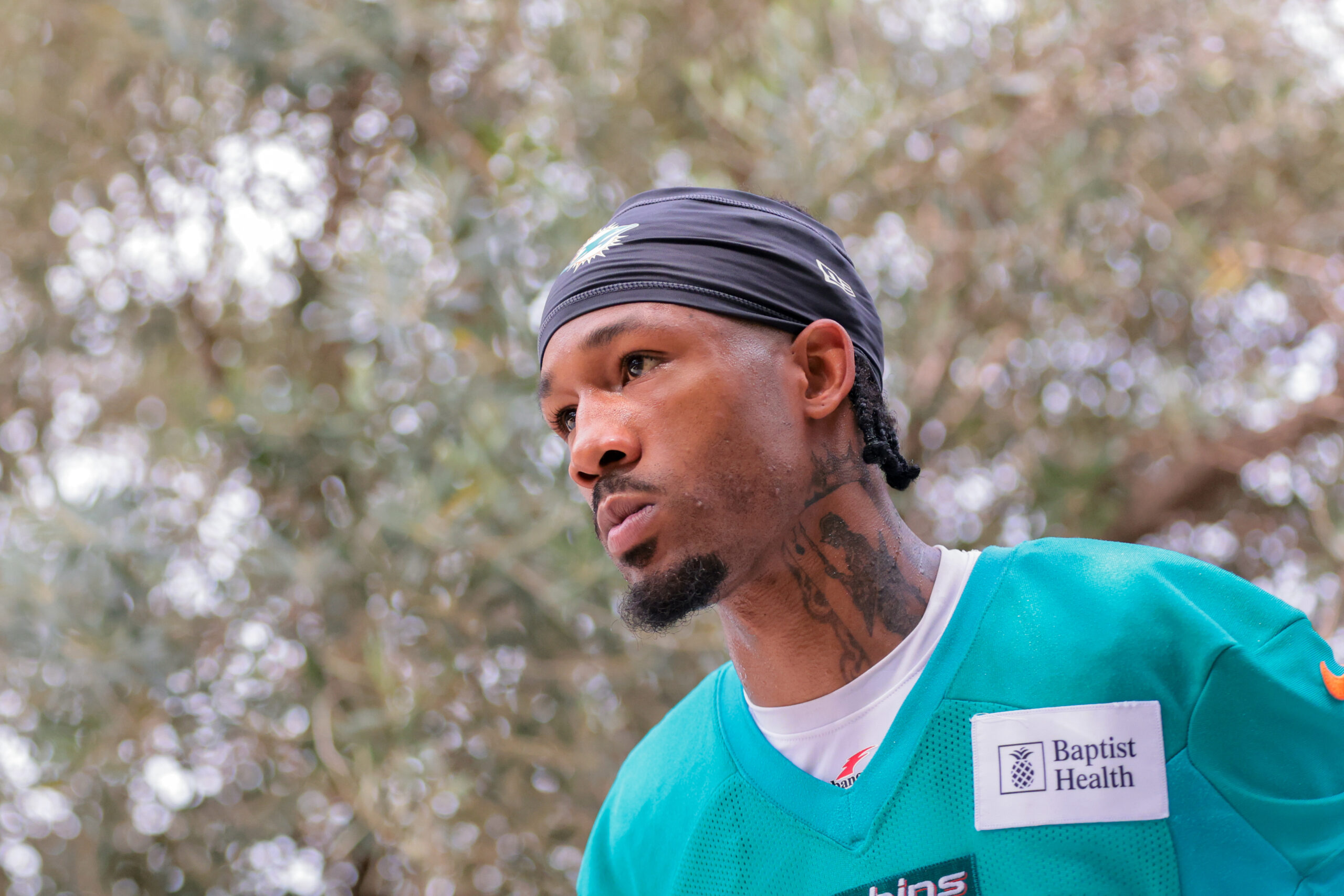 Jul 28, 2025; Miami Gardens, MI, USA; Miami Dolphins cornerback Jack Jones (23) looks on after speaking to reporters during training camp at Baptist Health Training Complex. Mandatory Credit: Sam Navarro-Imagn Images