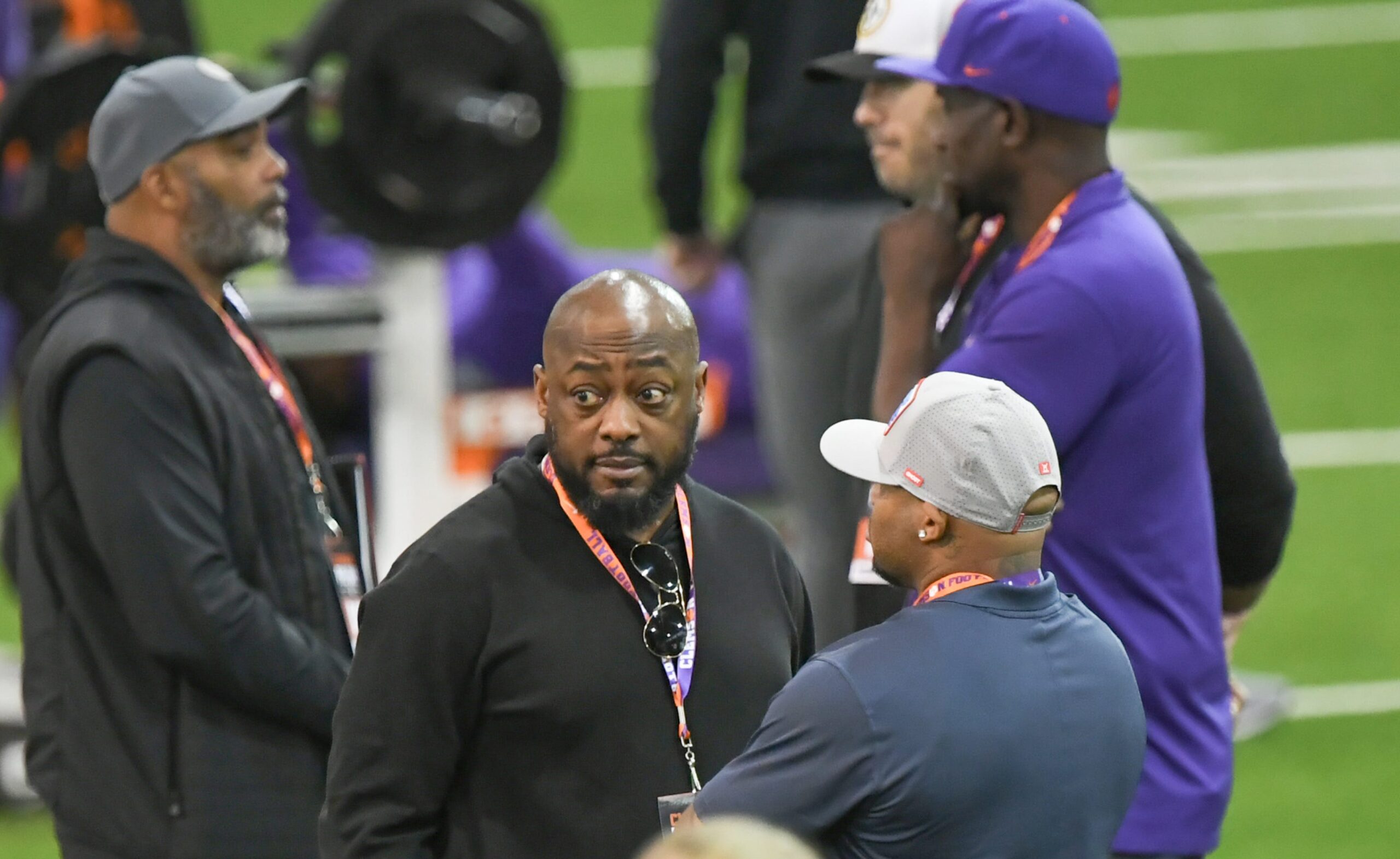Mike Tomlin, left, Head Coach of the Pittsburgh Steelers, near Clemson defensive coach Nick Eason, upper right, during Clemson FootballÕs 2025 Pro Day featured seven former football players, five showing speed and skills for NFL scouts before the draft April 24-26 in Green Bay.