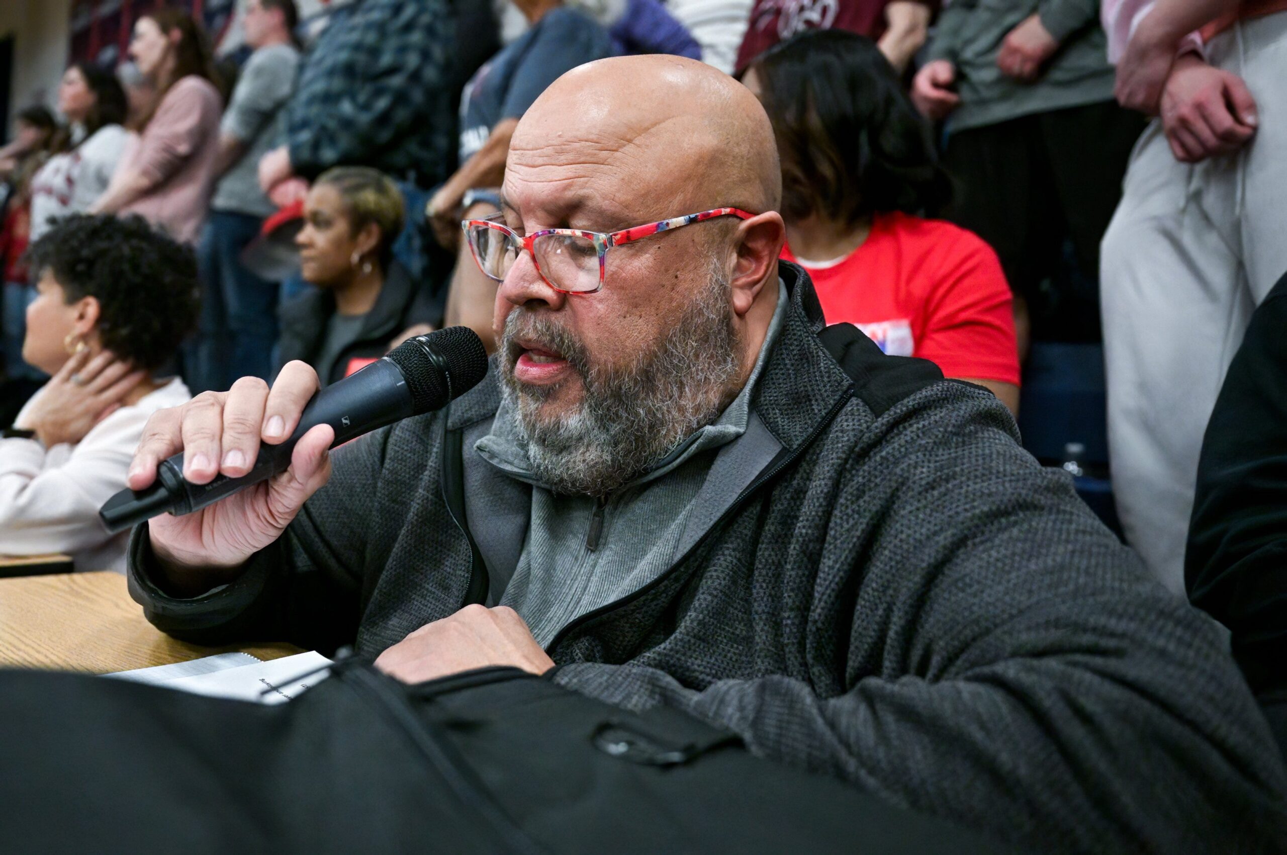 Terry Smith announces the lineups Feb. 20, 2026, at Hartley. (photo by John Hulkenberg)