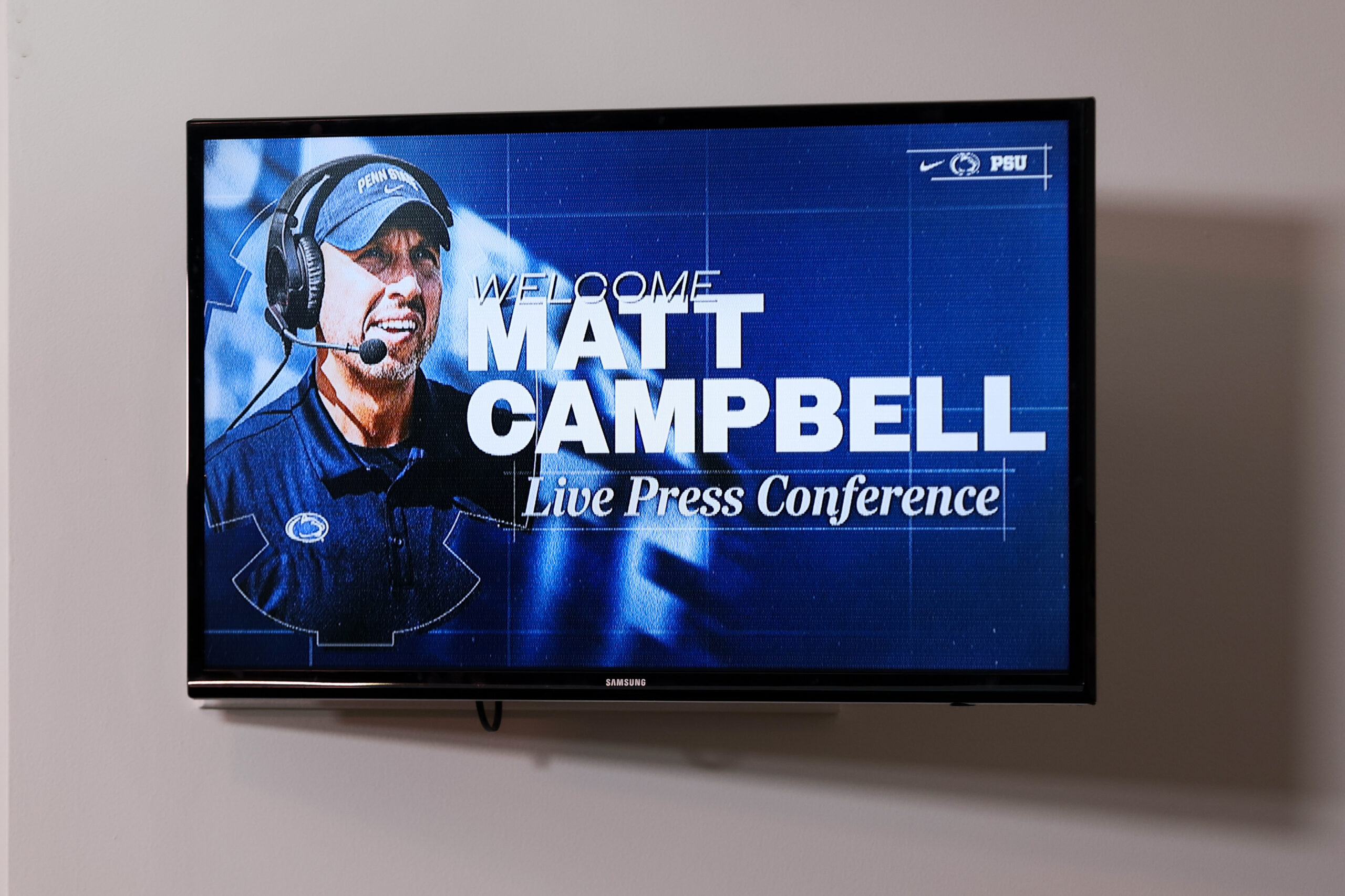 Dec 8, 2025; University Park, PA, USA; A general view of a television screen as Matt Campbell is announced as the Penn State Nittany Lions new head coach during a press conference at the Beaver Stadium Press Room. Mandatory Credit: Matthew O’Haren-Imagn Images