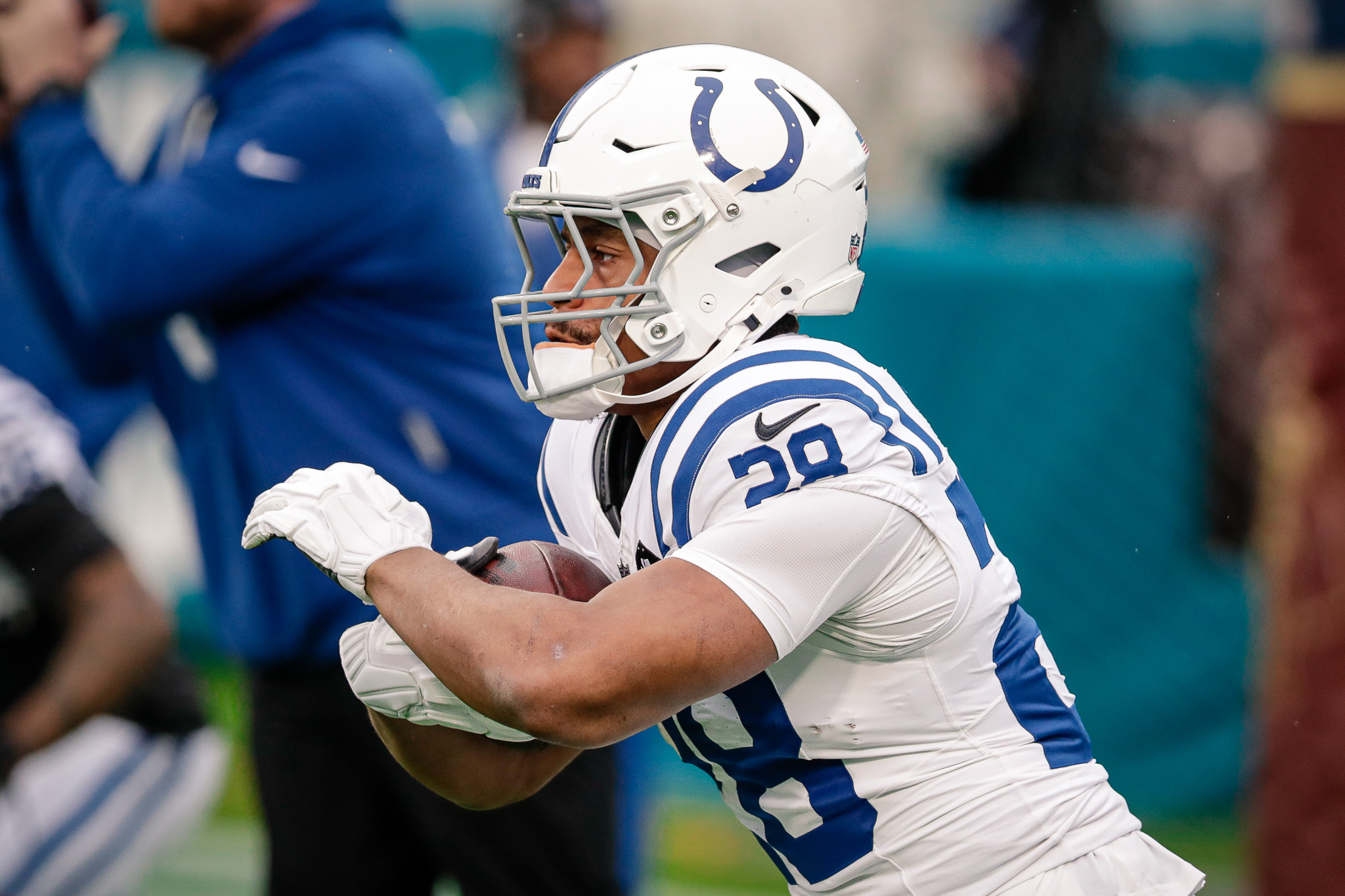 Dec 7, 2025; Jacksonville, Florida, USA;Indianapolis Colts running back Jonathan Taylor (28) warms up before an NFL game against the Jacksonville Jaguars at EverBank Stadium. Mandatory Credit: Travis Register-Imagn Images