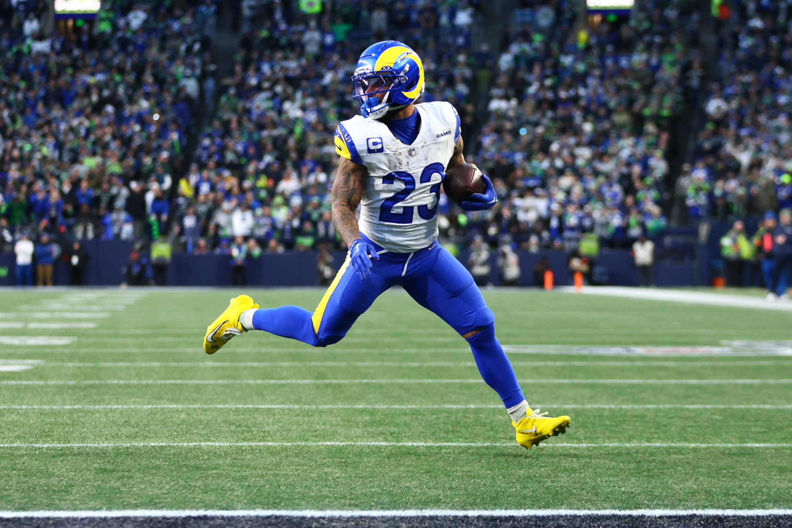 Jan 25, 2026; Seattle, WA, USA; Los Angeles Rams running back Kyren Williams (23) runs to score a touchdown against the Seattle Seahawks during the first half in the 2026 NFC Championship Game at Lumen Field. Mandatory Credit: Kevin Ng-Imagn Images