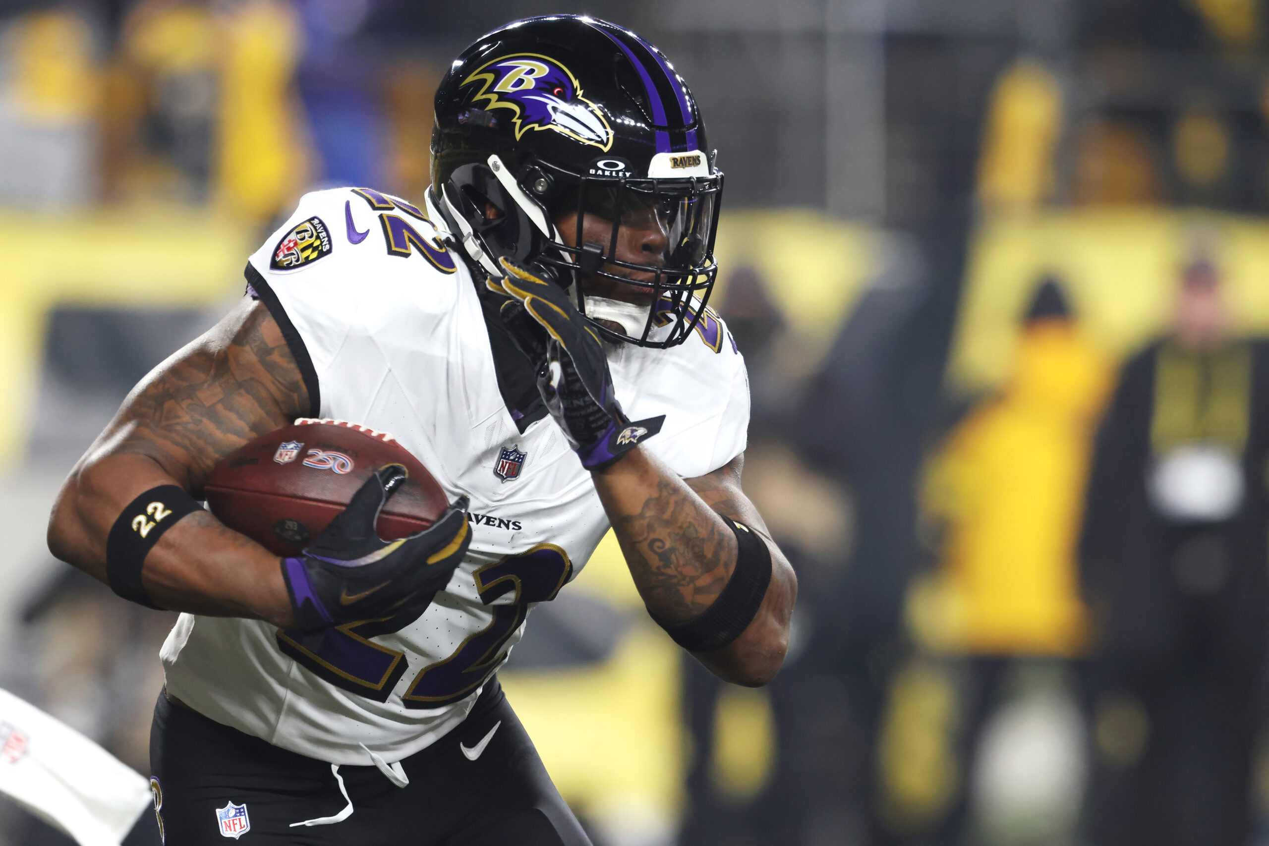Jan 4, 2026; Pittsburgh, Pennsylvania, USA; Baltimore Ravens running back Derrick Henry (22) rushes the ball against the Pittsburgh Steelers during the first half at Acrisure Stadium. Mandatory Credit: Charles LeClaire-Imagn Images