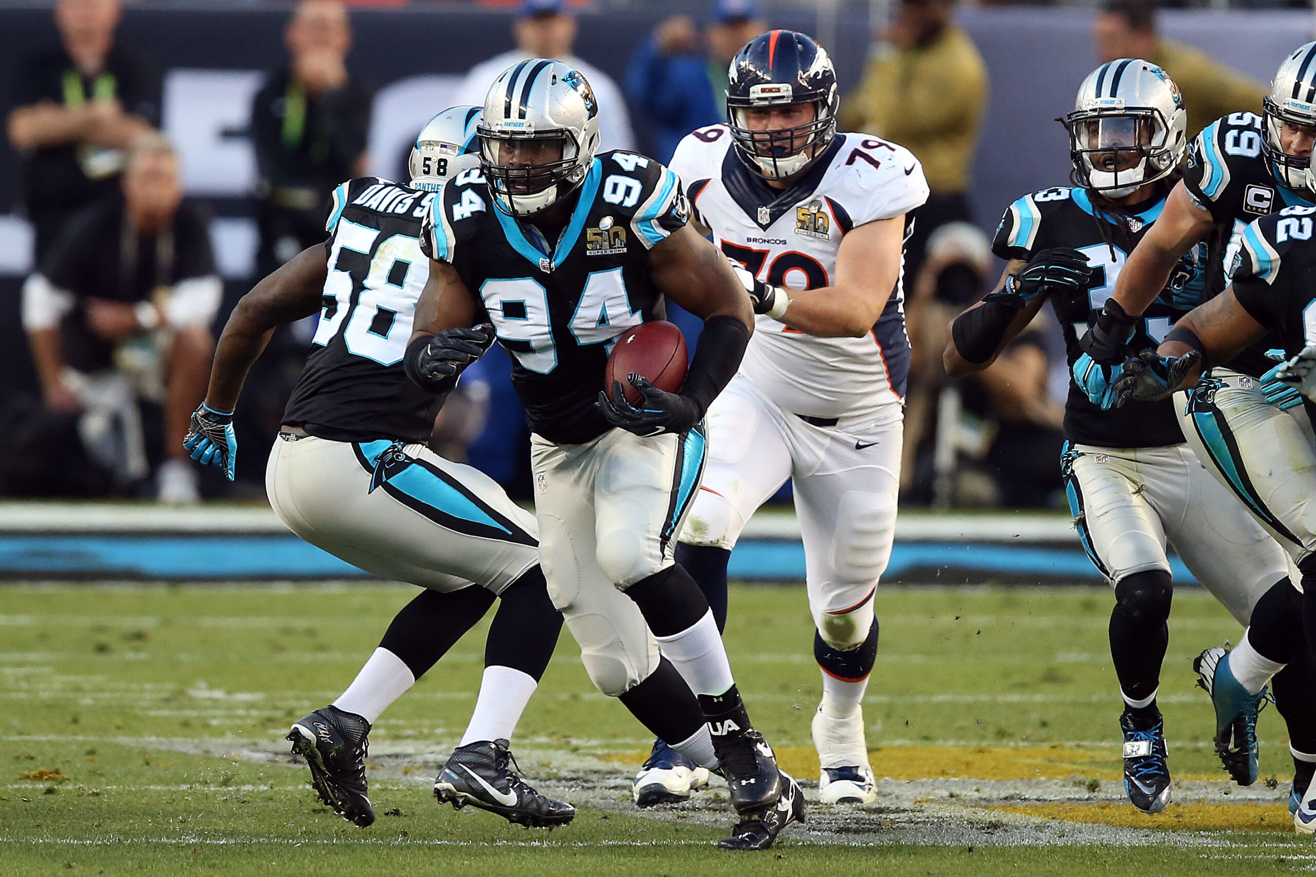 Feb 7, 2016; Santa Clara, CA, USA; Carolina Panthers defensive end Kony Ealy (94) runs the ball after an interception against the Denver Broncos in Super Bowl 50 at Levi’s Stadium. Mandatory Credit: Cary Edmondson-Imagn Images
