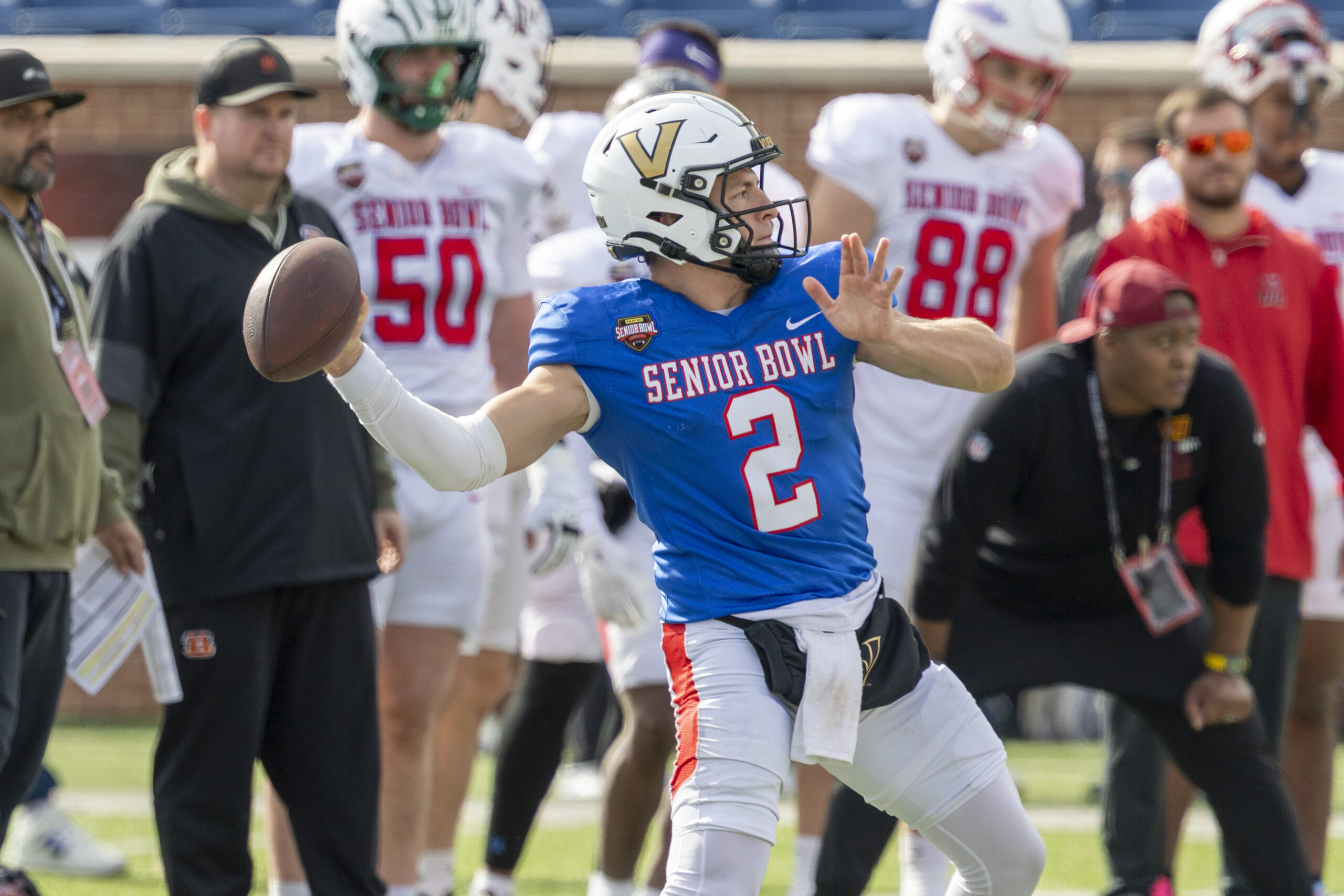Jan 31, 2026; Mobile, AL, USA; National quarterback Diego Pavia (2) of Vanderbilt throws the ball during the second half of the 2026 Senior Bowl at University of South Alabama, Hancock Whitney Stadium. Mandatory Credit: Vasha Hunt-Imagn Images