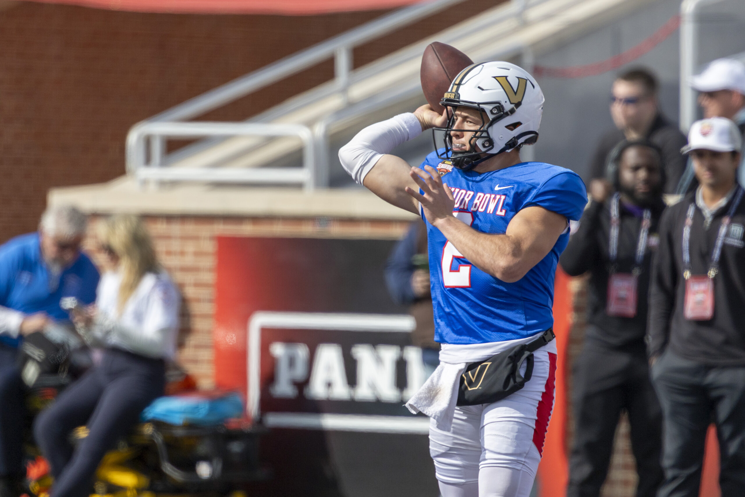 Jan 29, 2026; Mobile, AL, USA; National quarterback Diego Pavia (2) of Vanderbilt throws during National Senior Bowl practice at Hancock Whitney Stadium. Mandatory Credit: Vasha Hunt-Imagn Images
